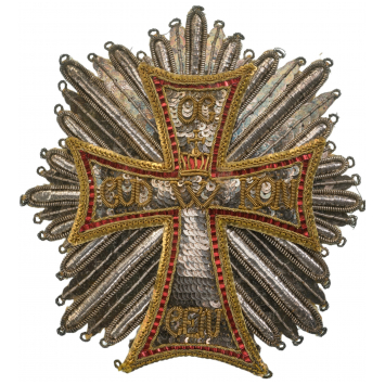 Grand Cross Star, 1st Class. Embroidered breast star, 97x89 mm., with rays made of different silver threads and tiny loops to af x the star to the habit, the centre also made of silver threads and sequines, red-lacquered, twisted silver strip to make the centre`s border, the reverse, with original, white morocco leather backing. A splendid star, in mint condition! I R!