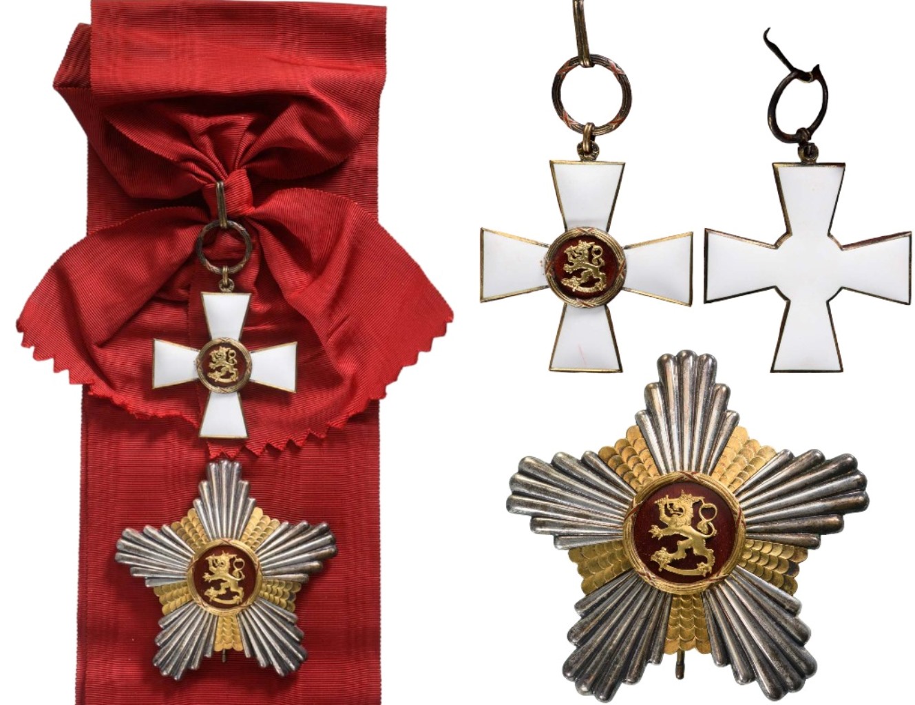 Grand Cross Set, 1st Class, instituted in 1942. Sash Badge, 59 mm, gilt Silver, Finnish hallmark "07 - 850 - crown", both sides enameled, obverse central medallion gilt Silver, enameled, original suspension loop and sash. Breast Star, partially gilt Silver, 82 mm, superimposed parts gilt and enameled, large pin on reverse. in case of issue by "A. Tillander" with Finnish coat of arms on the lid. A superb set in mint condition! I