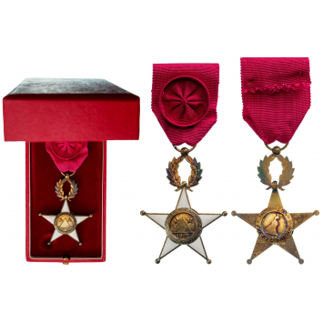 Officer`s Cross, 4th type, instituted in 1957. Breast Badge, 65x47 mm, gilt Silver, maker’s mark “Arthus-Bertrand, Paris”, obverse enameled, central medallion silver gilt, with laurel wreath suspension device and ribbon with rosette, in original case of issue by "Arthus Bertrand , Paris". I
