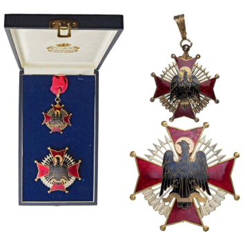Grand Officer's Set, instituted in 1944. Neck Badge, 55x47 mm, gilt Silver, one-side enameled, central medallion gilt silver, original suspension ring, ornamented loop and ribbon. Breast Star, 75 mm, sivered Bronze, superimposed part gilt, enameled, reverse with long vertical pin and two side hooks, in case of issue by "Cejalvo - Madrid". A superb and rare set, in mint state! I R!