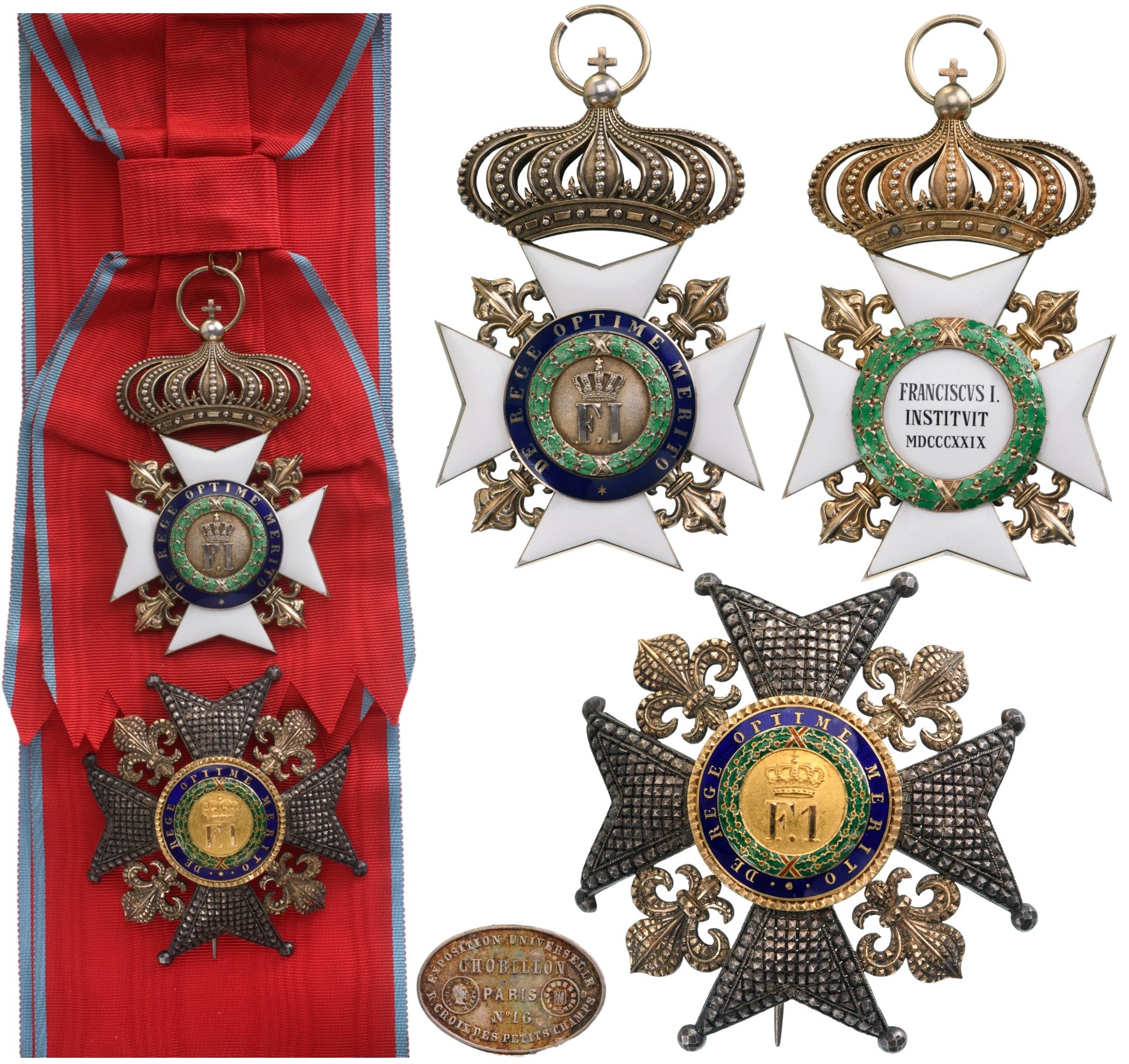 Grand Cross Set, instituted in 1829. Sash Badge, 98x60 mm, gilt Silver, white enameled arms, flanked by chiselled fleurs de lys, centre medallion with polished, crowned monogram on “frosted” ground, within green enamelled oak wreath, deep blue enameled outer circlet, with the Order’s motto “DE REGE OPTIME MERITO”, reverse centre medallion with deep blue enameled inscription on enameled ground, outer circlet made as a thick, green enameled oak wreath with orangered enameled berries and ties, typical suspension crown, fixed by