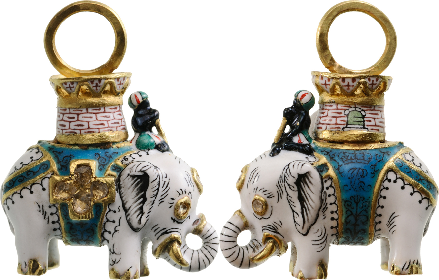 Order`s miniature jewel in GOLD, enamels, painting and brilliants, suspension ring made of gold wire of square section. An exceptional and very rare piece of the best quality and exact details of the end of the 18th Century, most possibly a work of a jeweller working on behalf of the Danish court.This one-class order, worn as a collar on ceremonial occasions, or wearing the badge suspended to a pale blue sash and a breast star, is Denmark`s highest chivalric distinction, its history dates back to 1464, thus being one of the most ancient and prestigious orders of Europe. In its evolution it was and still is awarded to foreign sovereigns and heads of states only, and to Danes with exceptional merits to the throne. At the death of a Knight, wherever he lived, the decoration of the Elephant is being recovered by emissaries of the Order`s Chapter.Provenance: Marechal Louis Nicolas Davout, Division General, Duc d`Auerstadt, Princed`Eckmuhl, 1770-1823. The only unbeated Marechal d`Empire, named Governor of the Duchy of Varsovia, the first who entered Berlin after defeating the Prussian Army.Dim.: 26x20 mm. (incl. suspension ring).I RR!