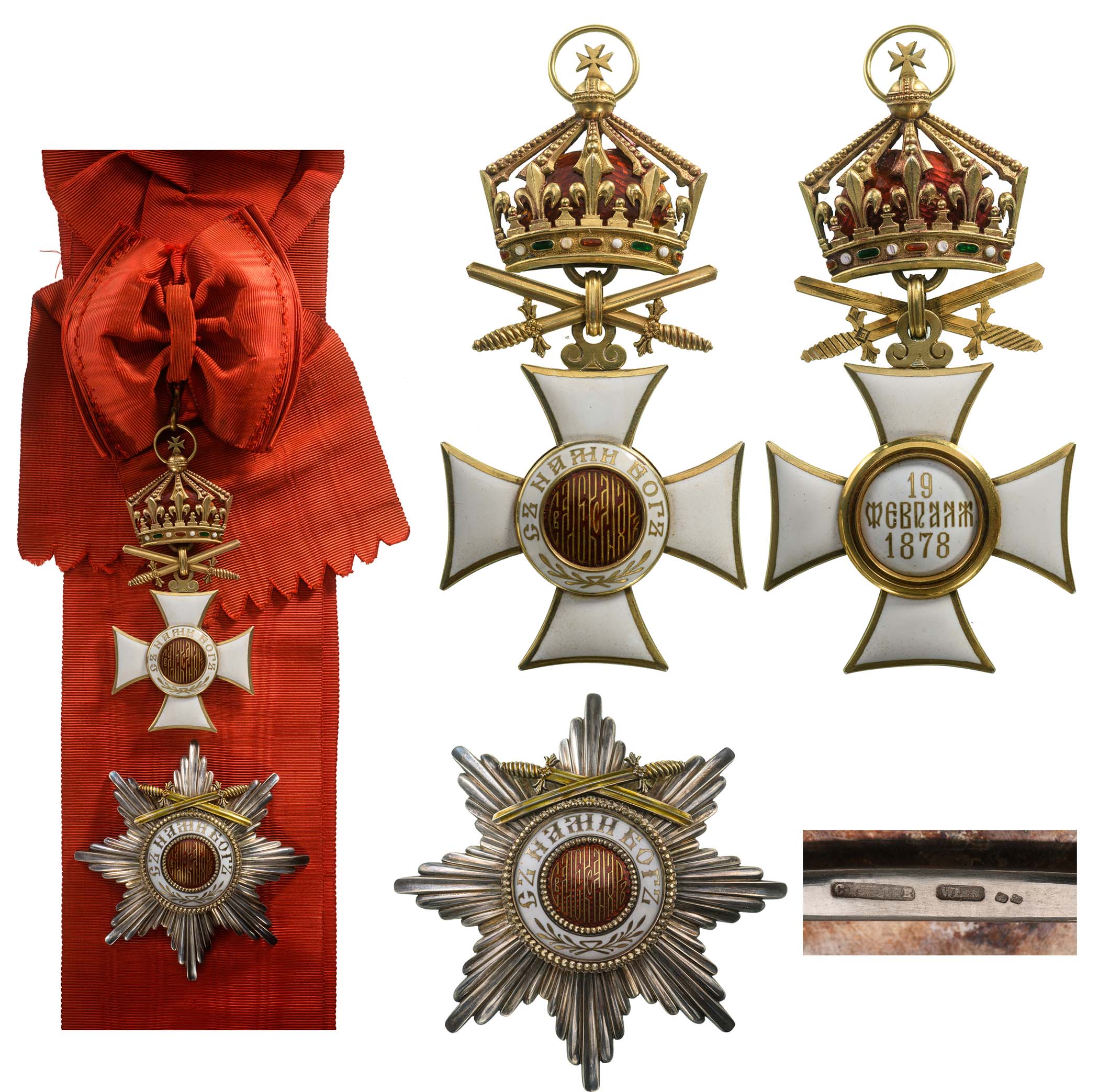 Grand Cross Set for Military in Time of Peace (Swords to the ring). Sash Badge, 110 x 54,5 mm., gilt silver, white enameled cross, red enameled centre medallion with golden cyrillic inscription, white enameled outer circlet with order’s motto in gold lettering and laurel branches, reverse medallion with the date of creation of the Bulgarian Principality in gold cyrillic lettering on white enameled ground and gilt, grooved outer circlet, typical, trefoil upper loop, grooved link-ring with inserted crossed swords, Bulgarian crown suspension with polychrome-enameled “jewels” and red enameled inner cap, movable suspension ring, no marks, but surely of Austrian manufacture prior to 1918, with original, sash ribbon (cut at its upper end for easier wear). Breast Star, 90 mm., Silver with smooth, convex and concave rays, red enameled, centre medallion, with golden cyrillic inscription, white enameled outer circlet with order’s motto in gold lettering and laurel branches, diamond-cut, gilt intermediate circlets, gilt crossed swords with blades pointing down, matted reverse with mirror-polished centre-disc, this, struck with Rothe & Neffe’s “FR” (within a lozenge) mark and the “greyhound’s head” and “A” silver marks, broad pin, struck with “C.F. ROTHE” – “WIEN” and two “A” marks. An important set in the best Austrian jewellers’ quality, of great rarity due to the limited award of this class and grade to high-ranking Army officers. I RR!