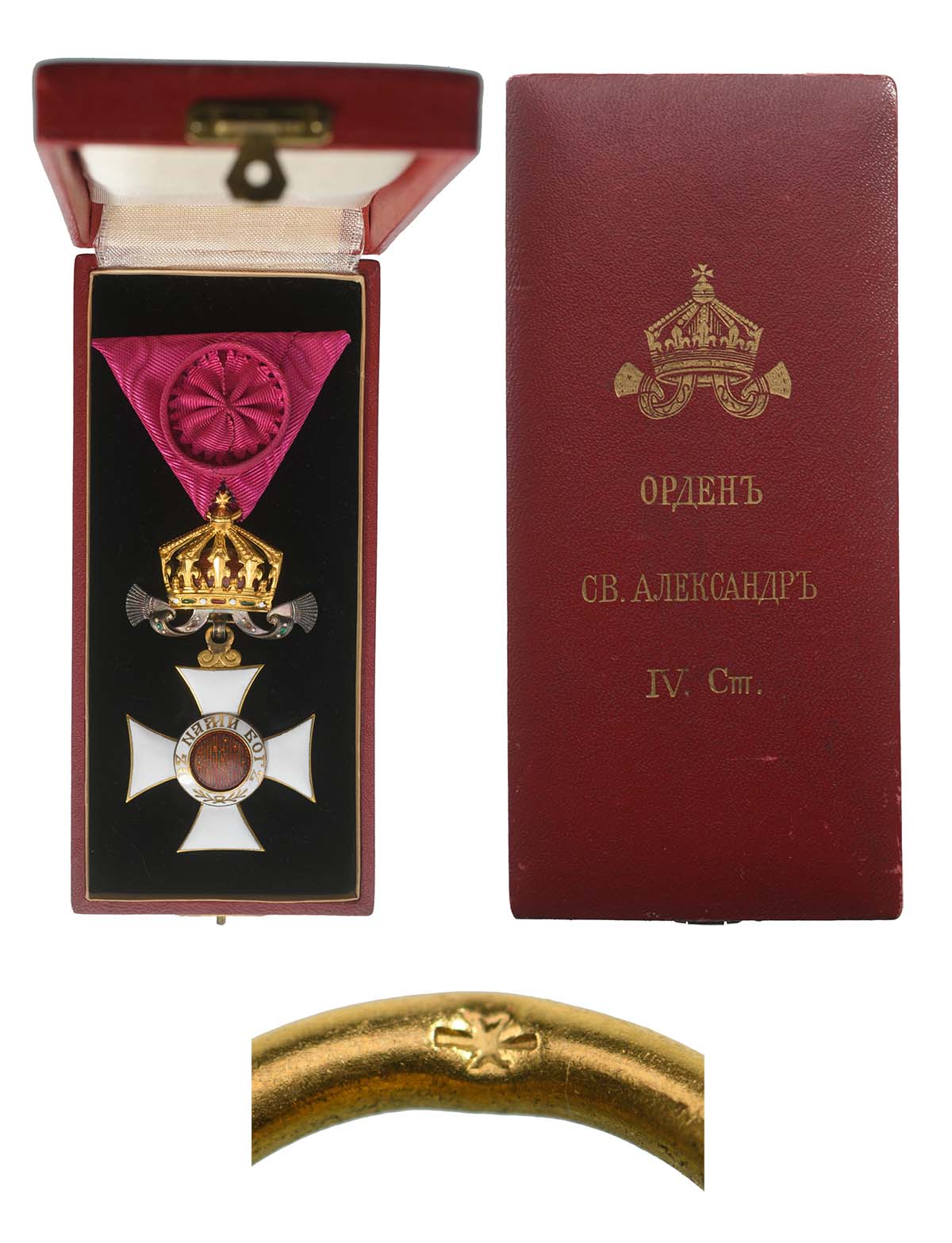 Officer's Cross with Crown, 4th Class. Breast Badge, 74x39 mm, gilt Silver, central medallion gilt, enameled, original suspension ring and triangular ribbon with rosette, in case of issue with gilt monogram on the lid. A superb badge, in mint condition! I