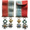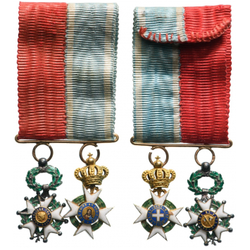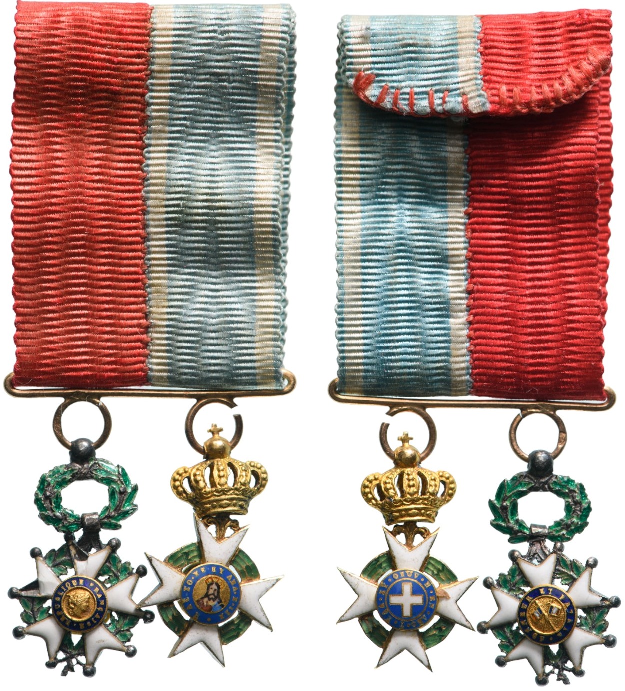 Greece: Miniature of the Cross of the Order, 18x12 mm, GOLD, enameled, obverse centre medallion with finest enamel painting of the Christ Pantokrator, original suspension ring; France: Legion of Honor, Knight, 19x12 mm., Silver, original suspension ring and ribbon, on gold suspension bar. Very elegant group, in excellent quality and condition. I - II