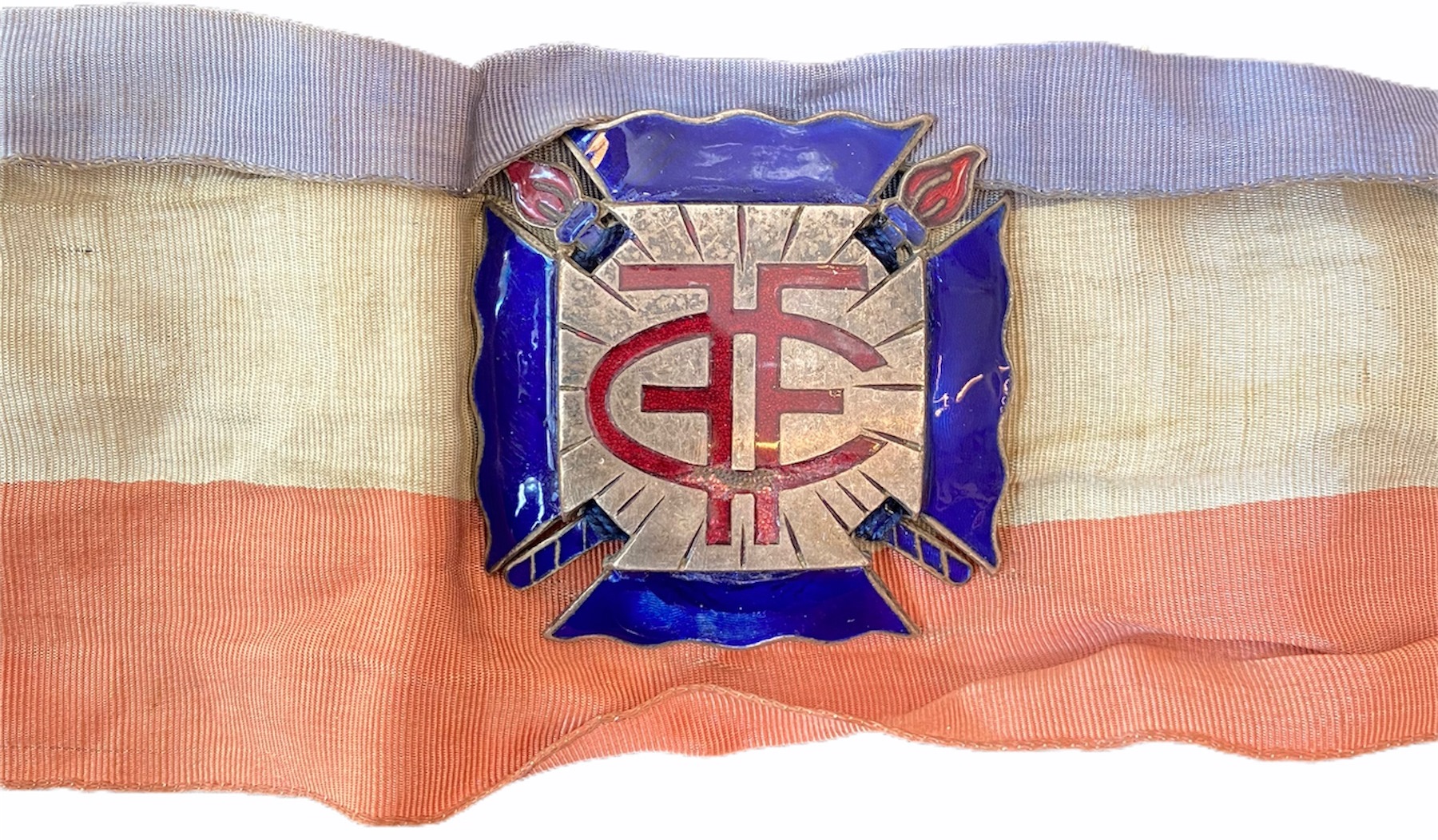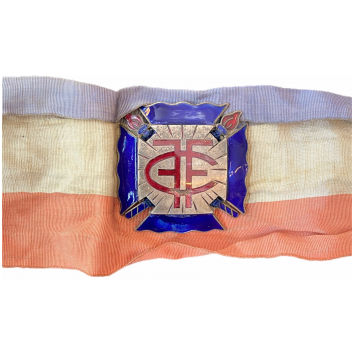 Armband with original enameled cross (chipping) , 50 mm, silvered Metal, attached to a French tri-color armband. I- The Association of the Crossfire or Association of Front Fighters and War Wounded Cited for Shining Action (1927-1936) was a French veterans movement, led by the Colonel Francois de La Rocque (1885-1946). The Croix-de-Feu association was dissolved in 1936, giving birth to the French Social Party (1936-1940), the largest mass party of the French right.