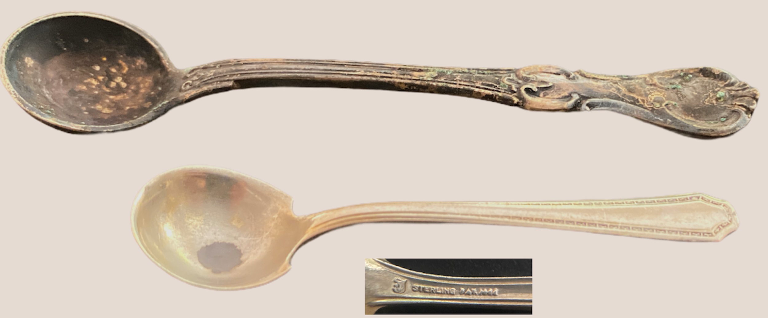 Lot composed of two silver salt scoops 1. Model "filet, violin, feuillagee shell", XIXth cen-tury, probably French, length 9.5 cm, 2. Art-deco model with flared spoon, American ster-ling guarantee hallmark, length 6.5 cm. Weight for both 14.3 gr. Good condition, dirty out of the attic.
