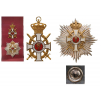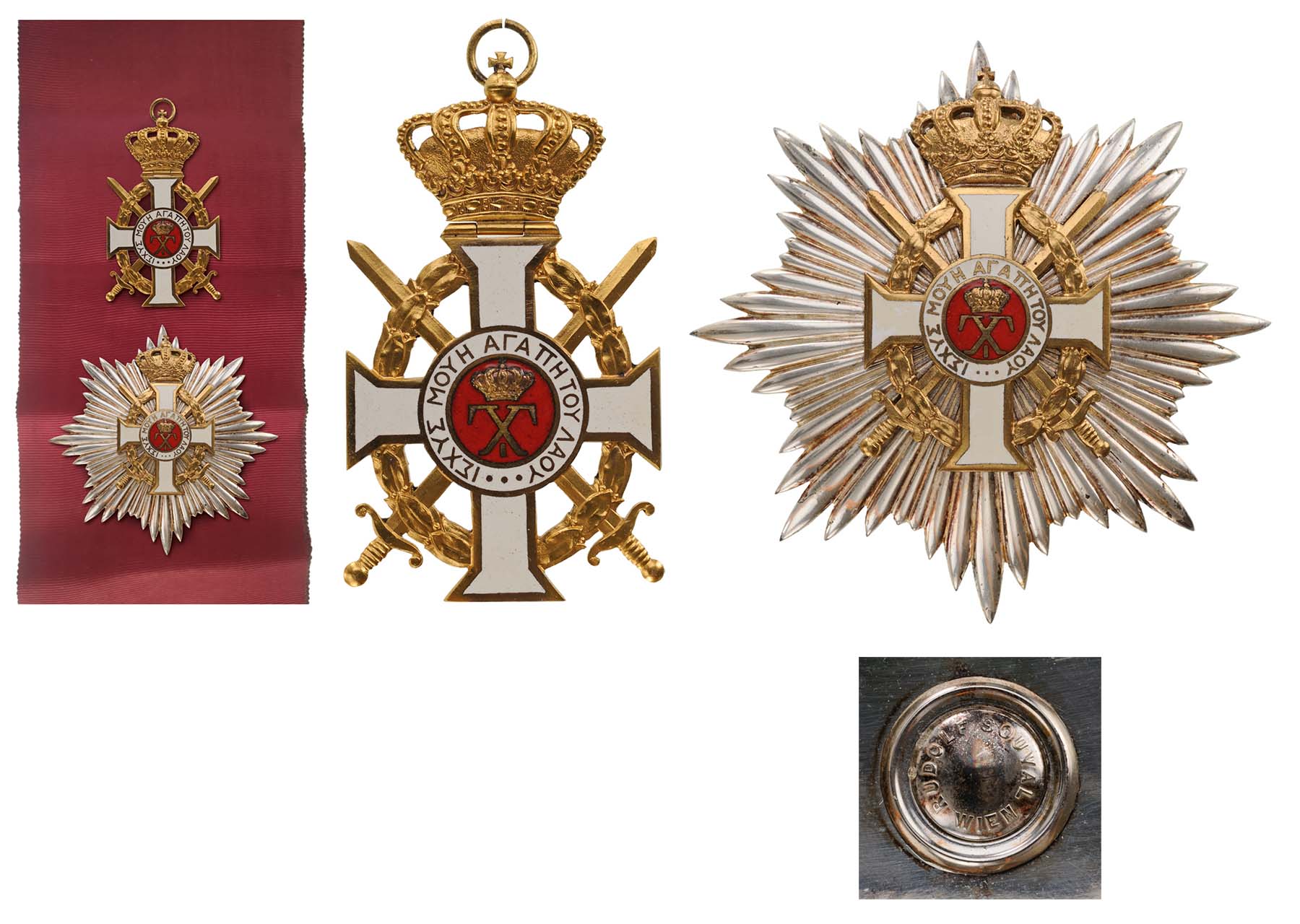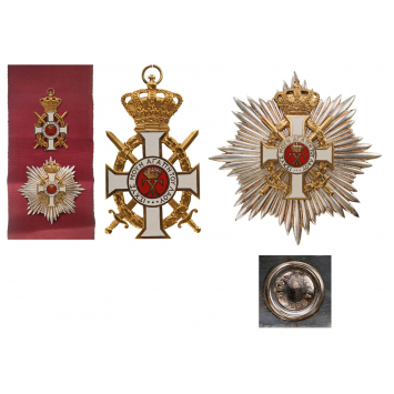 A complete Grand Cross set with Swords. Sash Badge, 83x48 mm, in gilt Silver, white and red enamels, large, crossed swords passing through the laurel wreath, plain, smooth reverse, hinged upper crown with circular suspension ring, short original sash. Breast Star, 87 mm, with pointed, smooth and highly polished rays, maker`s mark "Rudolf Souval, Wien", superimposed by the gilt and enameled order`s cross with swords, polished reverse with round, curved, tapering pin. An outstandingly rare set and maker,awarded less than 10 times, excellent condition. I RR!