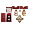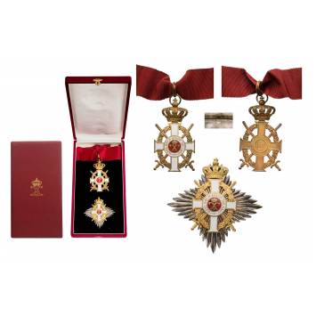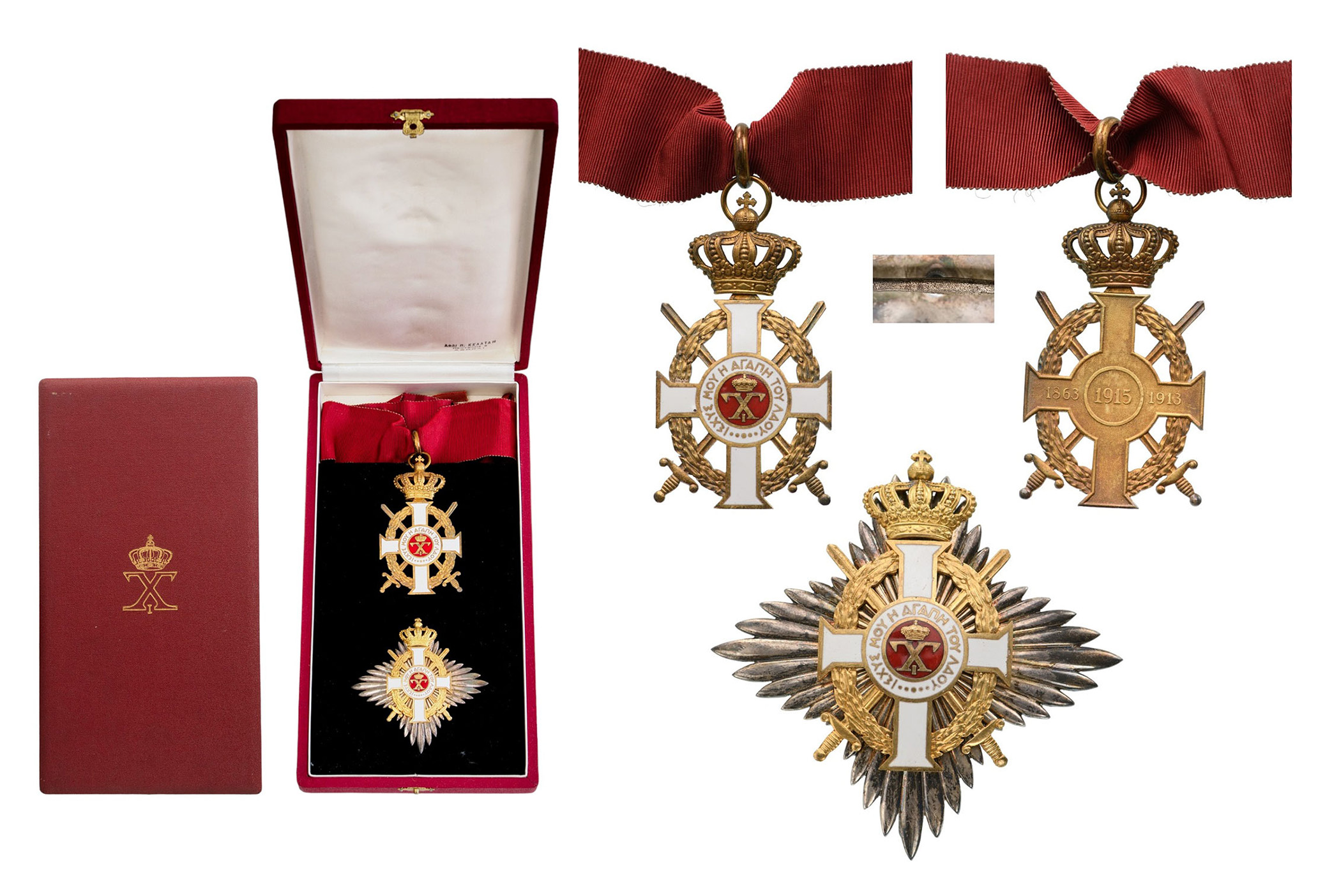 Grand Commander`s Set with Swords. Neck Badge, 84x46 mm, in gilt Silver and white enameled cross with a gilt laurel wreath and crossed swords between the arms, centre medallion with red enameled detail and an applied, royal crown, granulated reverse, with the date "1915" sided by the further two dates "1863" and "1913", original neck ribbon with ties, 4-pointed Breast Star, 76 mm, with smooth silver rays, superimposed with the order`s badge with swords in gilt silver, the reverse with vertical, broad pin, maker`s mark of "Kelaidis, Athens"and two hooks, in case of issue by "Kelaidis, Athens", with gilt monogram on the lid. A very rare and superb group. I RR!