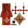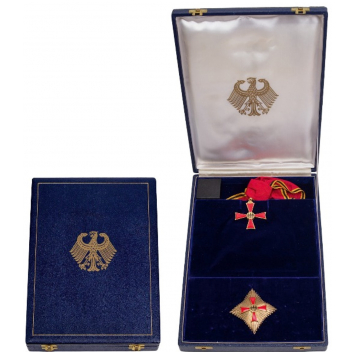 Grand Cross Set, instituted in 1951. Sash Badge, 71x59 mm, gilt Silver, both sides enameled, central medallion gilt Silver, original suspension loop and long complete sash. Breast Star, 83 mm, gilt Silver, with smooth rays, superimposed part gilt Silver, halmarked "800", maker's mark "St. & L.", enameled, reverse with tapered vertical pin, in original case of issue, with gilt eagle in and on the lid and boxed rosette. Scarce! I R!