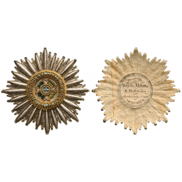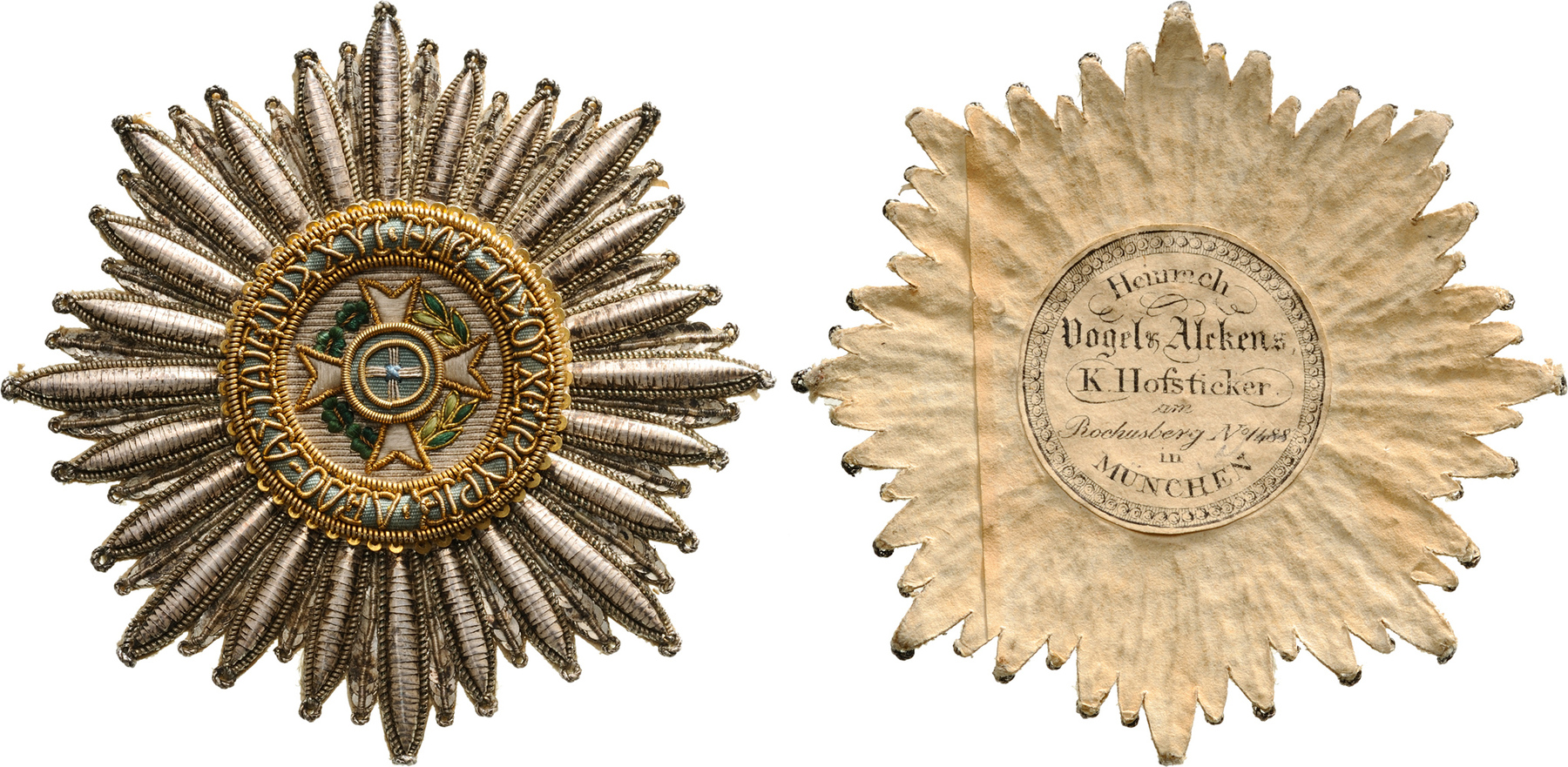 1st type Grand Cross Breast Star of the early, official, embroidered type, 81 mm, with rays of silver-strip and paillettes, the centre embroidered in colour thread outlined with gold wire and inscription on the outer circlet, the reverse backing in ivory-coloured paper with maker`s label of Heinrich Vogel & Alckens, Munich. A star in fantastic condition for it`s age! I R!