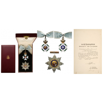 Grand Officer's Set of the 2nd Type. Neck Badge, 71x48 mm, gilt Silver with white enameled cross and broad green enameled oak and laurel wreath between the arms, obverse centre medallion gilt with portrait of Christ in enamel miniature painting, blue enameled outer circlet with the Order`s motto, blue enameled reverse medallion, with white cross in the centre, surrounded by Greek inscription in gold lettering, hinged suspension crown with chiseled "jewels" and round suspension ring and loop, with original ribbon. Breast Star, 76 mm, hallmarked "925", with chiseled and pierced rays with a finest "brilliant" effect, centre medallion as that of the badge`s obverse, but with chiseled, gilt, inner and outer rings, the reverse with round, vertical pin and two hooks, in case of issue by "C.F. Zimmermann, Pforzheim", together with Awarding Document to Henri Dumesnil, Vice Admiral of the French Navy, dated 1919. Extremely rare fabrication, of best German jeweller's quality! RR! I