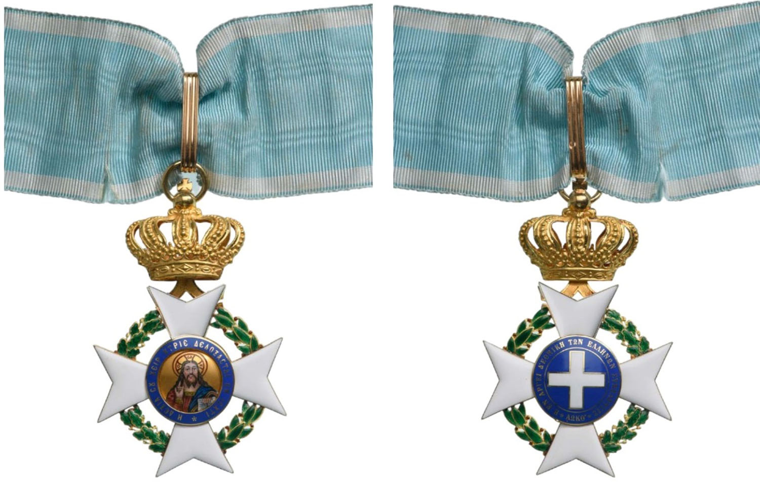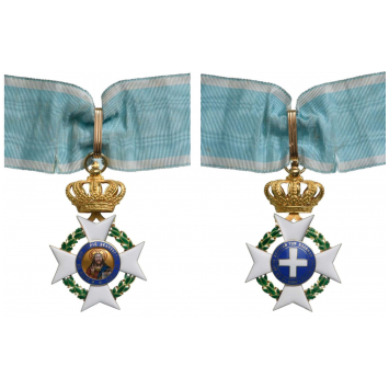 Commander's Cross, 72x46 mm, GOLD, enameled, obverse centre medallion with finest enamel painting of the Christ Pantokrator, large, bulbous crown, original suspension ring, loop and ribbon. Excellent quality and condition. I