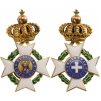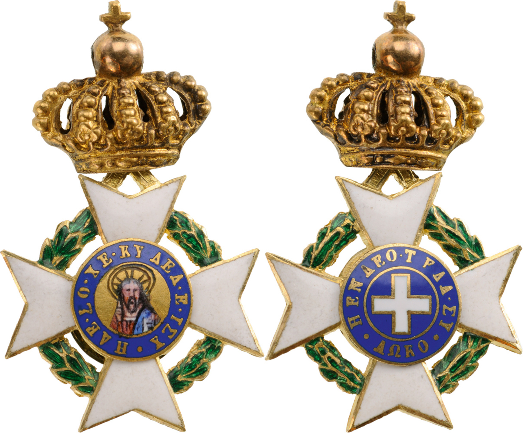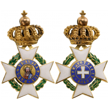 Miniature of the Cross of the Order, 25x16 mm, in GOLD and enamels, original suspension ring missing, obverse centre medallion with finest enamel painting of the Christ Pantokrator, large, bulbous crown, a very large miniature. Excellent quality and condition. I