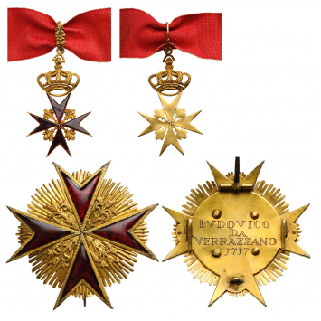 Knight Grand Cross. Fire-gilt Copper Maltese Cross, 77x45 mm, the arms, set with red glass pastes, alternated by gilt Florentine flowers, upper crown in one-piece with the cross with marine shell-shaped finial (the Order is also known as a Naval Order), ribbon ring with rich, chiseled floral ornament, red, neck ribbon, Breast Star, 70 mm, also of fire-gilt Copper, with applied arms, set with red glasses, bright polished beams with Florentine flowers, the reverse with old, engraved inscription "LVDOVICO DA VERRAZZANO 1717", 4 nuts retaining the obverse`s details, iron pin and two side-hooks. A beautiful set of great rarity, dating to the 18th Century, it is the most illustrious and ancient order of Tuscany, instituted by Cosimo de Medici, seigneur of Florence and 1st Duke of Tuscany. It was awarded firstly to military of the highest rank for their merits in fighting the moors in defence of Christianity and of the Commerce, besides humanitarian merits also. It was reinstituted by the Grand Duke Ferdinand III. Its chapel in Pisa is adorned with the flags and coats-of-arms of the ancient knights. Ludovico da Verrazzano was a Tuscan admiral, at the end of 17th to the early 18th Century, commander of the galleys belonging to the Order, another member of the family, Giovanni da Verrazzano (Greve in Chianti, Tuscany, 1485 - Guadalupa, 1528), was a famous navigator, whose descriptions of his travels to the New World were the first, thorough reports of the almost newly discovered territories of North America. The bridge on the Narrows in New York, opened to the traffic in 1964, known as "The Verrazano", honours his memory and discoveries. I-/I RR!