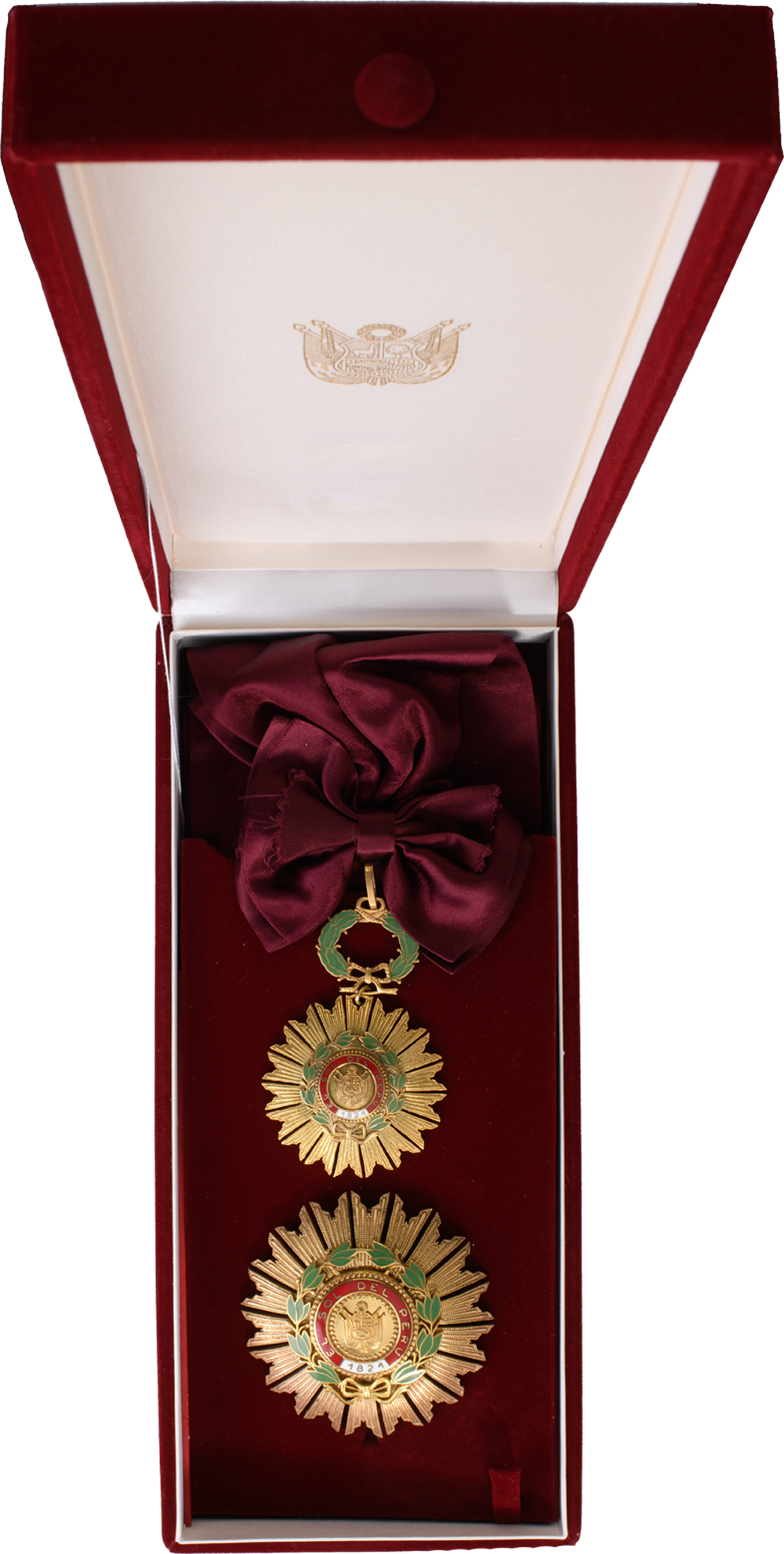 Grand Cross Set, 1st Class, instituted in 1821. Sash Badge, 89x58 mm., gilt Bronze, maker's mark "Zuloeta S.A.", one-side enameled, central medallion gilt, original suspension wreath, loop and complete sash. Breast Star, 79 mm., gilt Bronze, maker's mark "Zuloeta S.A.", with smooth rays, superimposed parts bronze gilt, enameled, large vertical pin on reverse, in original case of issue with gilt weapon in the lid. Scarce set in mint condition! I R!