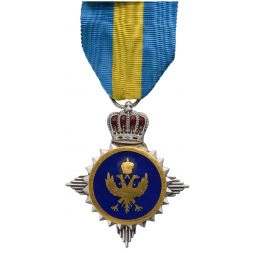 Breast Badge, 68 mm., gilt and silvered Metal, radiant cross in the style of a breast star, central medallion gilt and blue enameled, Imperial crowned eagle at center. A very rare probably exile medal of a pretendant of the Romanov Dynasty! I RR!