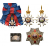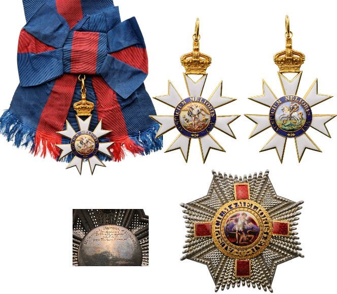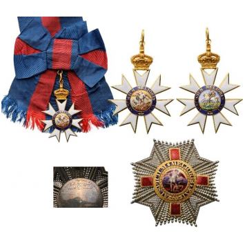 An Early Group for a Knight Grand Cross. Sash Badge, 89x68 mm., GOLD, with white enameled arms, centre medallion with the image ground and applied, polychrome enameled, golden bas-relief images of St. Michael and St. George, within blue enameled outer circlets (minor chips to the circlet to the side with St. Michael) with the Order’s motto “AUSPICIUM MELIORIS ÆVI” in gold lettering, upper Royal crown with strong, round suspension ring, with original, shortened sash, fitted with button-holes to be worn on the court dress. Breast Star, 90 mm., with chiselled and pierced silver rays, the centre in gold, with red enameled arms and large, centre medallion with the image of St. Michael defeating the devil, in the finest enamel, miniature painting, within chiselled gold rings, deep- blue enameled outer circlet with separately-made, applied Order’s motto in finely chiselled/engraved gold, the reverse fitted with vertical pin made of red gold, centre disc with engraved maker’s mark “RUNDELL BRIDGE & RUNDELL, JEWELLERS TO HIS MAJESTY and all THE ROYAl FAMILY”.