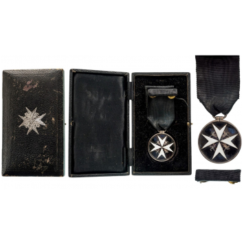 Officer's Cross / Serving Brother, instituted in 1888,. Breast Badge, 39 mm, Silver, original suspension ring, ribbon and ribbon bar, in original case of issue, with silver weapon on the lid. A superb badge, in best condition! I
