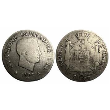 SKU: 336 Auction has finished. Total bids: 0ITALY - KINGDOM of LOMBARDYSilver, 24.4 g., Bare head to left. NAPOLEONE IMPERATORE E RE / Crowned coat of arms. REGNO - D'ITALIA. KM 10. VF Shop ID: HAR 1002Auction LXIV