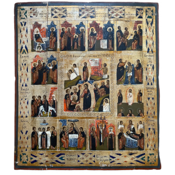 Polychrome rectangular icon on panel, Orthodox iconography, scenes from the life of Jesus in twelve paintings surrounding a central cartouche "the glory of Christ", among which one can easily identify: the annunciation, the motherhood of the virgin, the presentation in the temple, the miracles (Lazarus, the Paralythic ...), the entry into Jerusalem, the trial of Pilate, the entombment... Borders enhanced by a large frieze in crosses and notes in cartridges. Beautiful composition, testimony of popular piety. Ancient Greek work from the beginning of the 19th century. Good condition. Dimensions 36 x 31 cm.