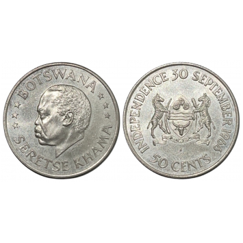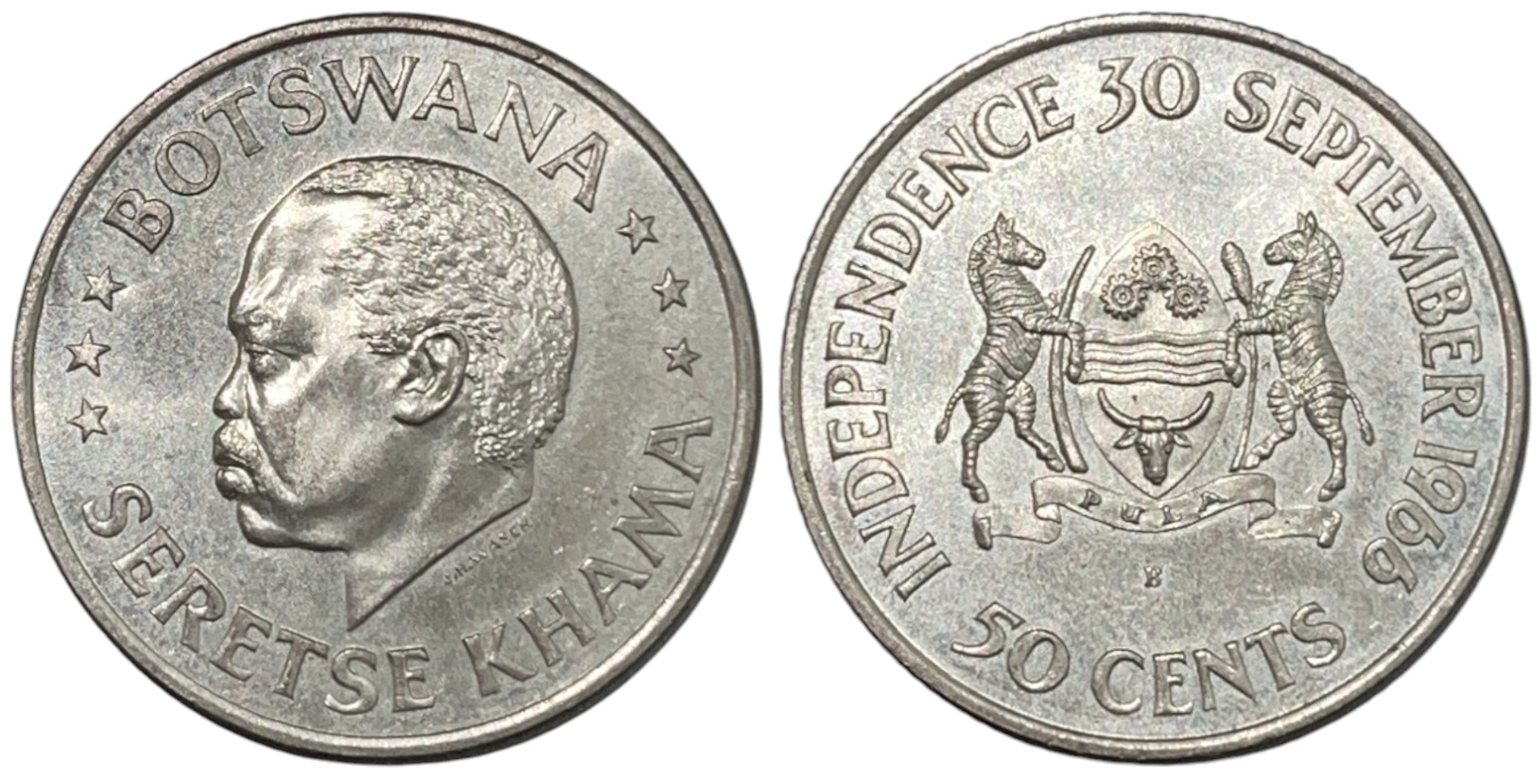 Silver, 10.00 g., 26 mm., National arms with supporters, denomination below / Sir Seretse Khama left. KM# 1, Schön# 1, N# 17784. UNC!
