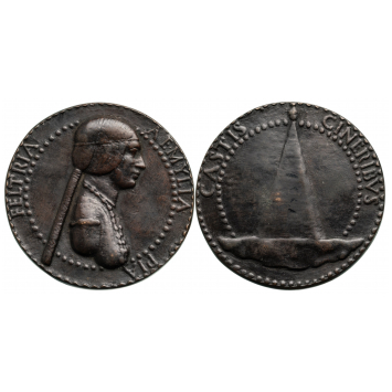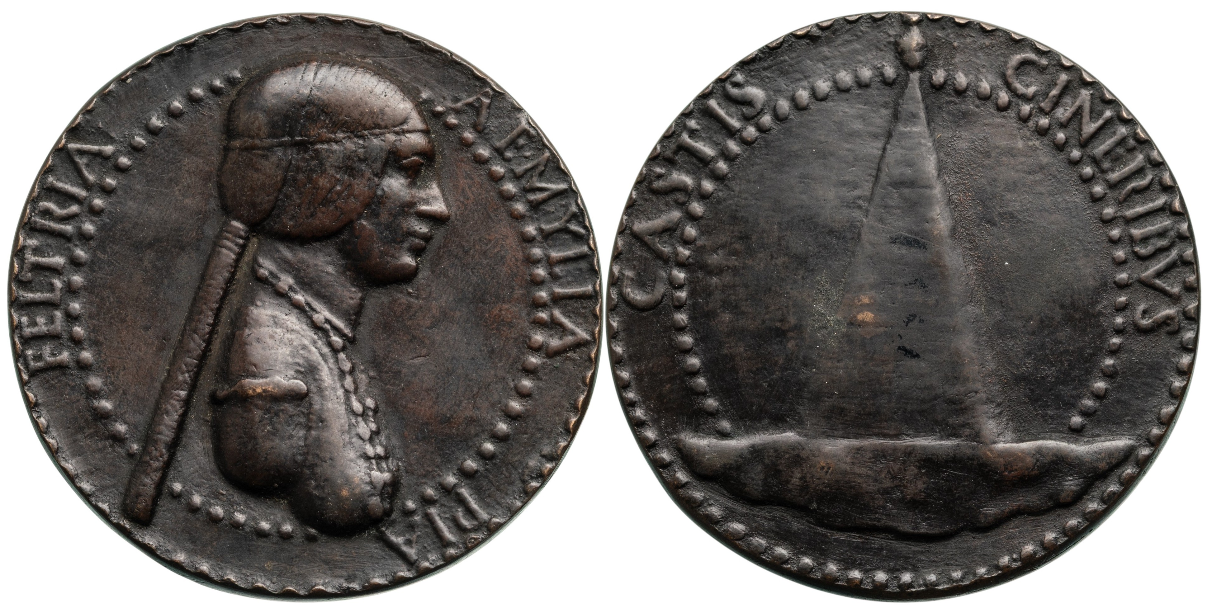 Bronze, (78 mm., 150.00 g.) Bust right, her hair tied behind in a long plait, AEMYLIA PIA FELTRIA / a tall pyramid surmounted by an urn, CASTIS CINERIBVS. Hill, Corpus 345; Arm II, 118, 55. A superb and rare old cast medal! UNC-! R!