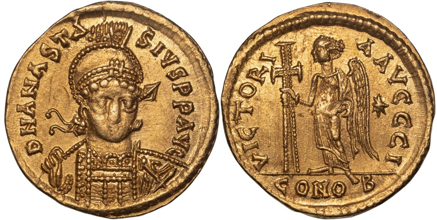 D N ANASTA-SIVS P P AVC Helmeted and cuirassed bust of Anastasius I facing, head turned slightly to right, wearing diadem, holding a spear with right hand and a shield, ornamented with a horseman, over left shoulder / VICTORI-A AVCCC I Victory standing left, holding long cross; in right field, star; in exergue, CONOB. Superb Mint State, as struck! FDC!