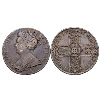 Silver, 29.86 g., Second draped bust left, toothed border surrounding both sides, legend reads ANNA DEI GRATIA / crowned cruciform shields, plain angles, nine strings to Irish harp, garter star at centre with sunburst, date flanking top crown, legend surrounding MAG BRI FR ET HIB REG, edge inscription *DECVS ET TVTAMEN ANNO REGNI SEPTIMO. S. 3601; Bull 1344; ESC 104. Superb old cabinet patina! VF+
