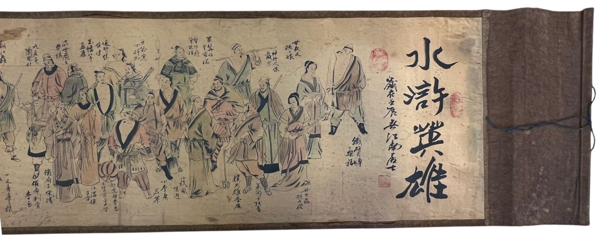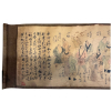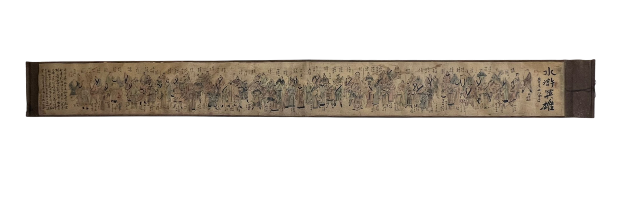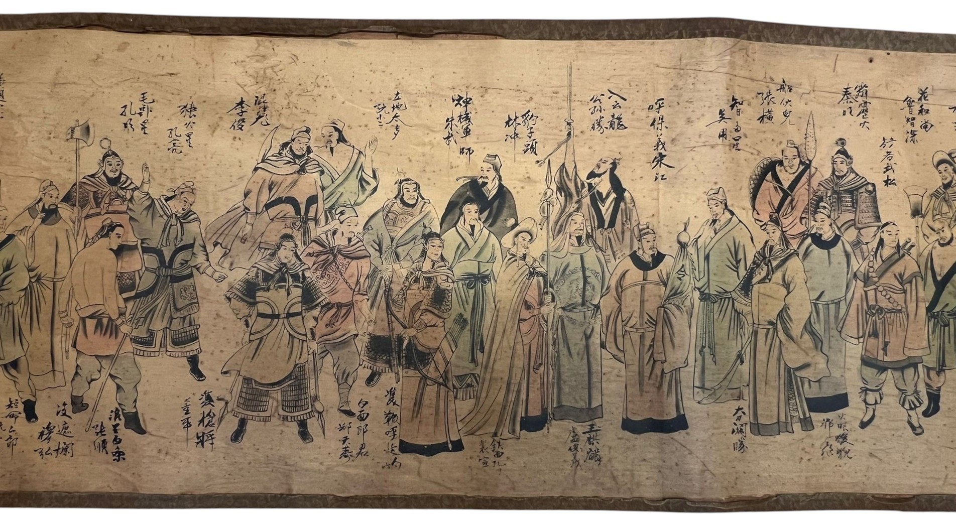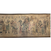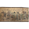 Spectacular apologetic kakemono/makimono scroll based on the painted original, composed of a vast frame engraved on paper (ukiyo-e style) and enhanced in color, representing a large number of court figures (nobles, soldiers, samurai, courtesans, etc.) in the image of traditional pre-Meiji society, each figure depicted full-length, facing forward, in an advantageous posture, designated by “kanji” calligrams. Important explanatory text on a border. Red-stamped workshop and executor hanko buckets. Mounted on textile (silk). Work from the early third of the 19th century. This vast, masterfully depicted fresco, a work of excellent craftsmanship in the engraved transcription of the painted original and in the subtlety of the colors, is imbued with striking realism and nostalgia for the Sakoku values that the ancient empire embodied. The interior weave is in a very fine state of preservation, fresh and preserved. Old damp stains on the exterior of the weave. Extraordinary, very rare and decorative scroll, of very important dimension! Dim. 333 x 34 cm. I-II RR!