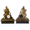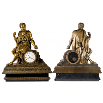 Important bronze mantel clock with golden patina, representing Aristotle the stagirite seated draped, the wooden base richly engraved on the front with foliage. The enameled dial with Roman numerals. The attributes of the philosopher (rolled manuscripts including undoubtedly "Happiness is born from virtue" are missing. Clock to be revised with missing glasses. Superb quality with great fine carving. French work from the beginning of the 19th century. Good general condition. Overall dimensions 67 x 55 cm, 47 cm for the statue alone. SUperb!