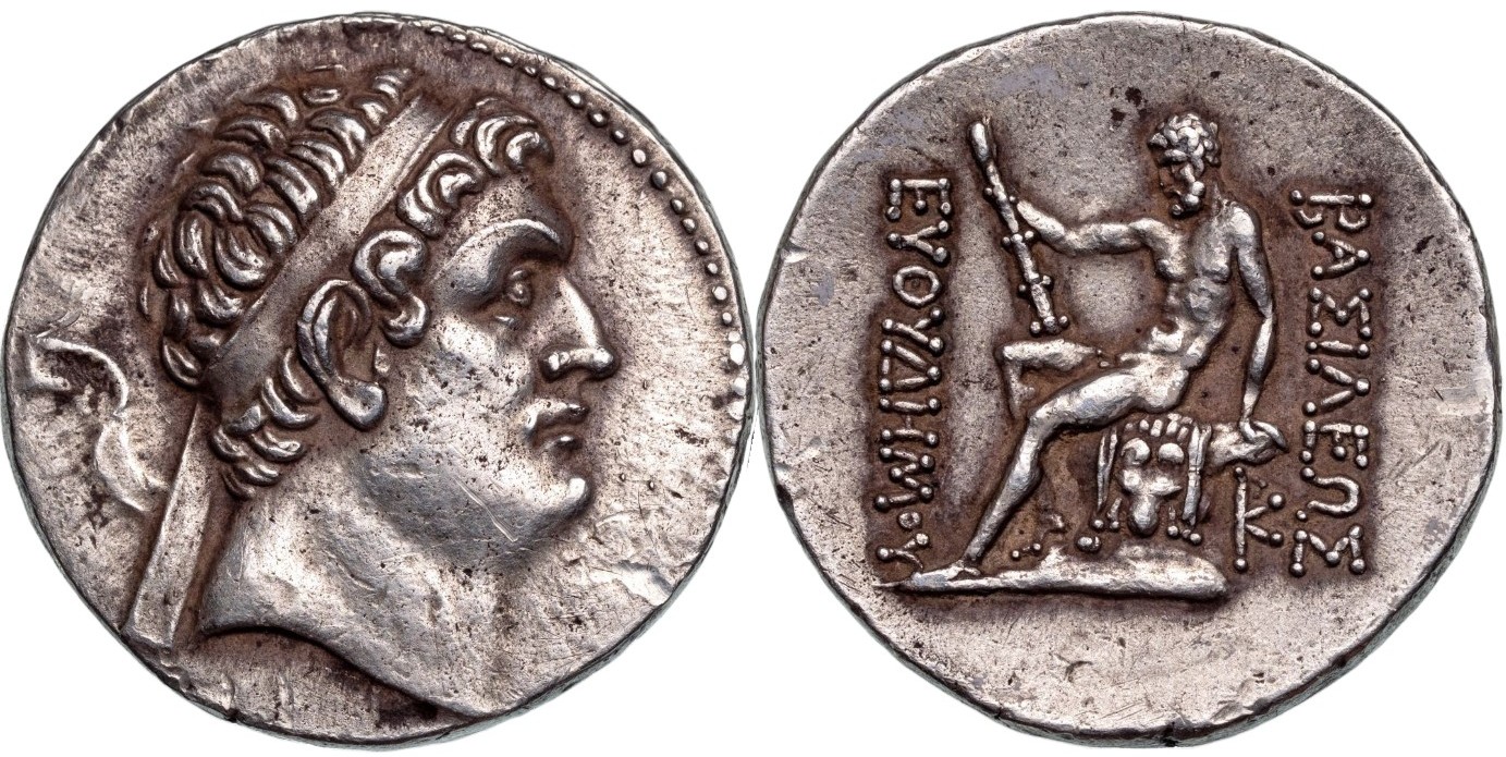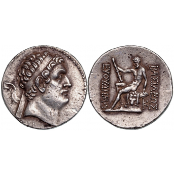 Diademed head of Euthydemus right, with soft, idealized features / BAΣIΛEΩΣ / ΕΥΘΥΔΗΜΟΥ, Heracles, nude, seated left on rock, right hand balancing club on knee, leaning back on left hand, KP monogram to lower right. Bopearachchi 9A. XF+/XF. Superb portrait, good style!