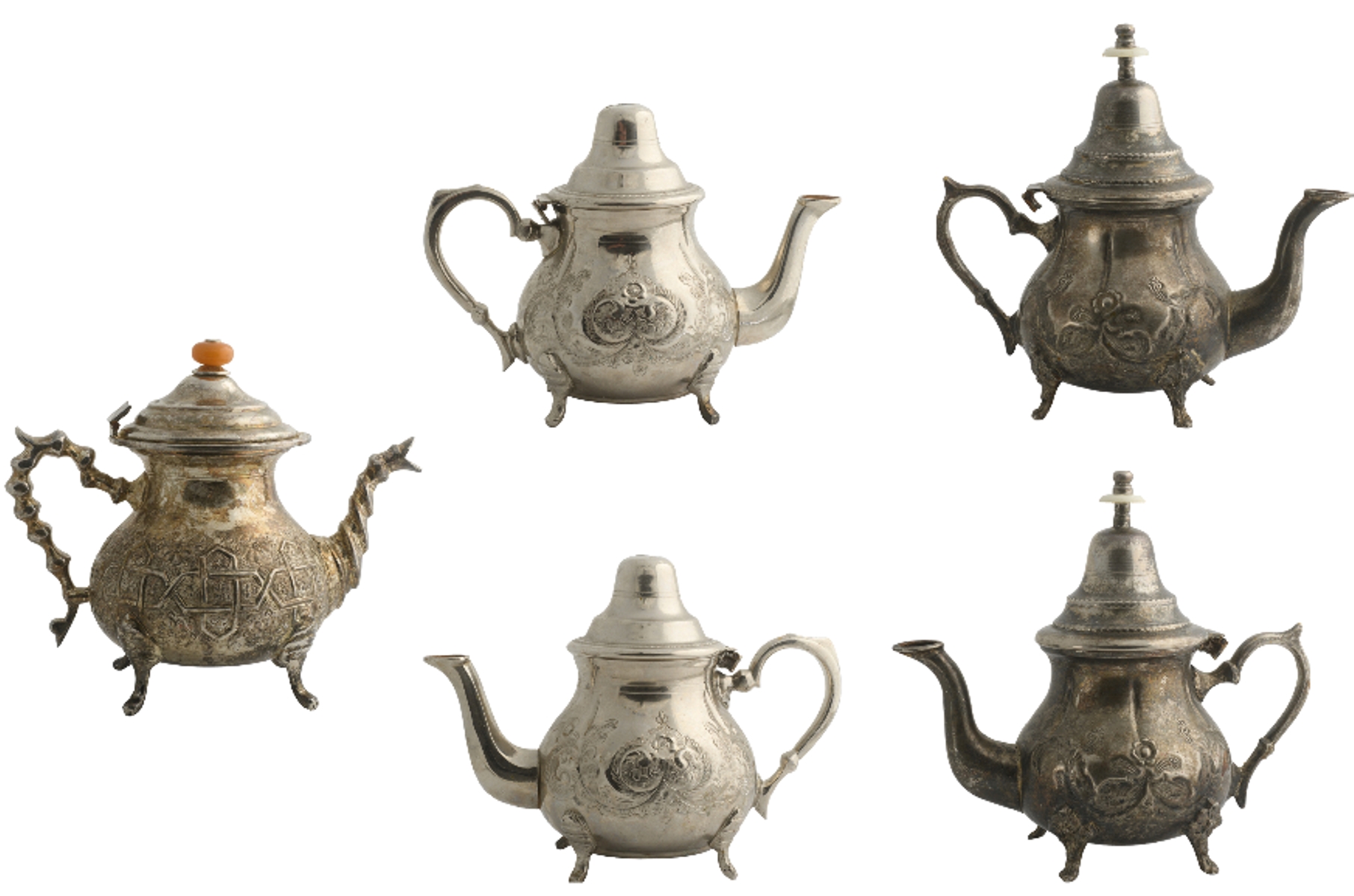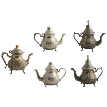 1.baluster-shaped model on four feet with folding lid, pot-bellied, large recto-verso engraved decoration with double medallion and volutes (probably a wedding gift), height 18 cm at the seed. Good general condition, Central European work around 1900.2.baluster-shaped model on four feet with folding lid, pot-bellied, molded handle and twisted spout, orange color composite seed, large stylized geometric decoration engraved in relief on both sides, height 16.5 cm at the seed. Good general condition, original work from Eastern Europe (South Caucasus) at the end of the 19th century. II