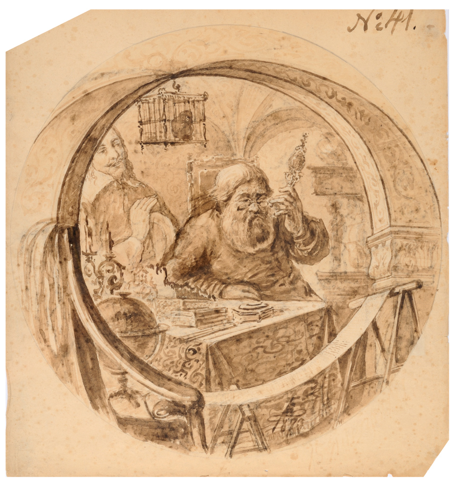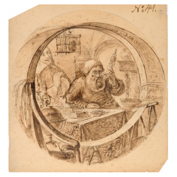 Circular view representing an "Usurer", subject of a popular tale, monogram "E" of Nikolai Ludwigovich Ellert in January 13th, 1873. The famous composer Tchaikovsky created in Moscow (supervisor Nicolas Rubinstein) symphony no. 2 "Little Russia" on January 26th, 1873, based on Ukrainian folk tales. Ellert was stage draftsman in charge of decorations of Imperial Opera in Moscow and likely produced this preparatory watercolor for this occasion. Sheet in good condition, dimensions 44.5x41.5 cm.