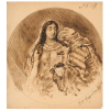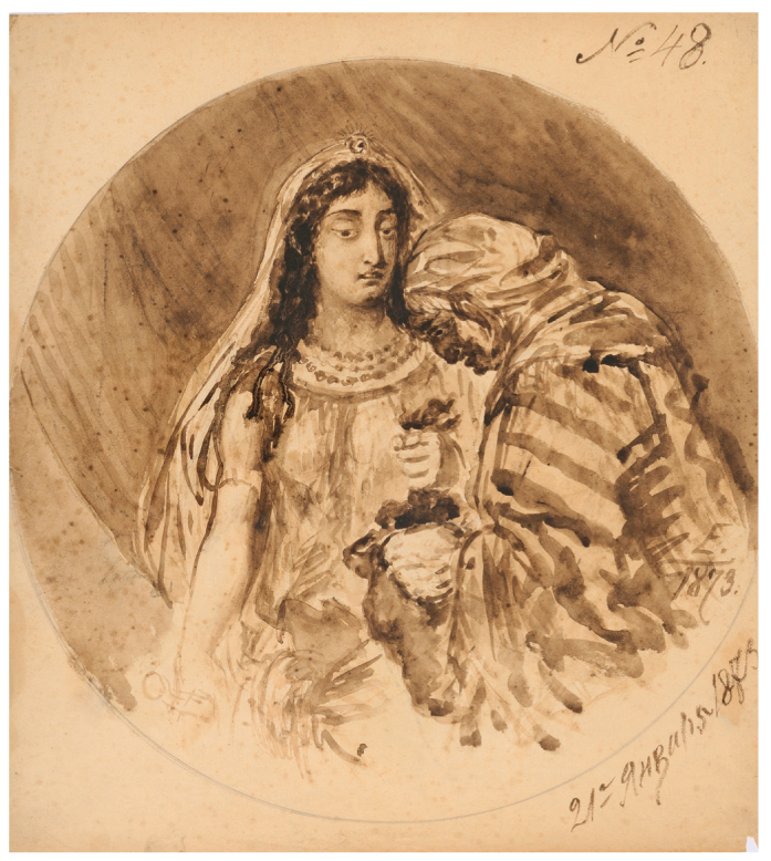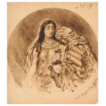 Circular view representing "Characters and an animal head", subject of a popular tale, monogram "E" of Nikolai Ludwigovich Ellert in January 13th, 1873. The famous composer Tchaikovsky created in Moscow (supervisor Nicolas Rubinstein) symphony no. 2 "Little Russia" on January 26th, 1873, based on Ukrainian folk tales. Ellert was stage draftsman in charge of decorations of Imperial Opera in Moscow and likely produced this preparatory watercolor for this occasion. Sheet in good condition, dimensions 44.5x41.5 cm.