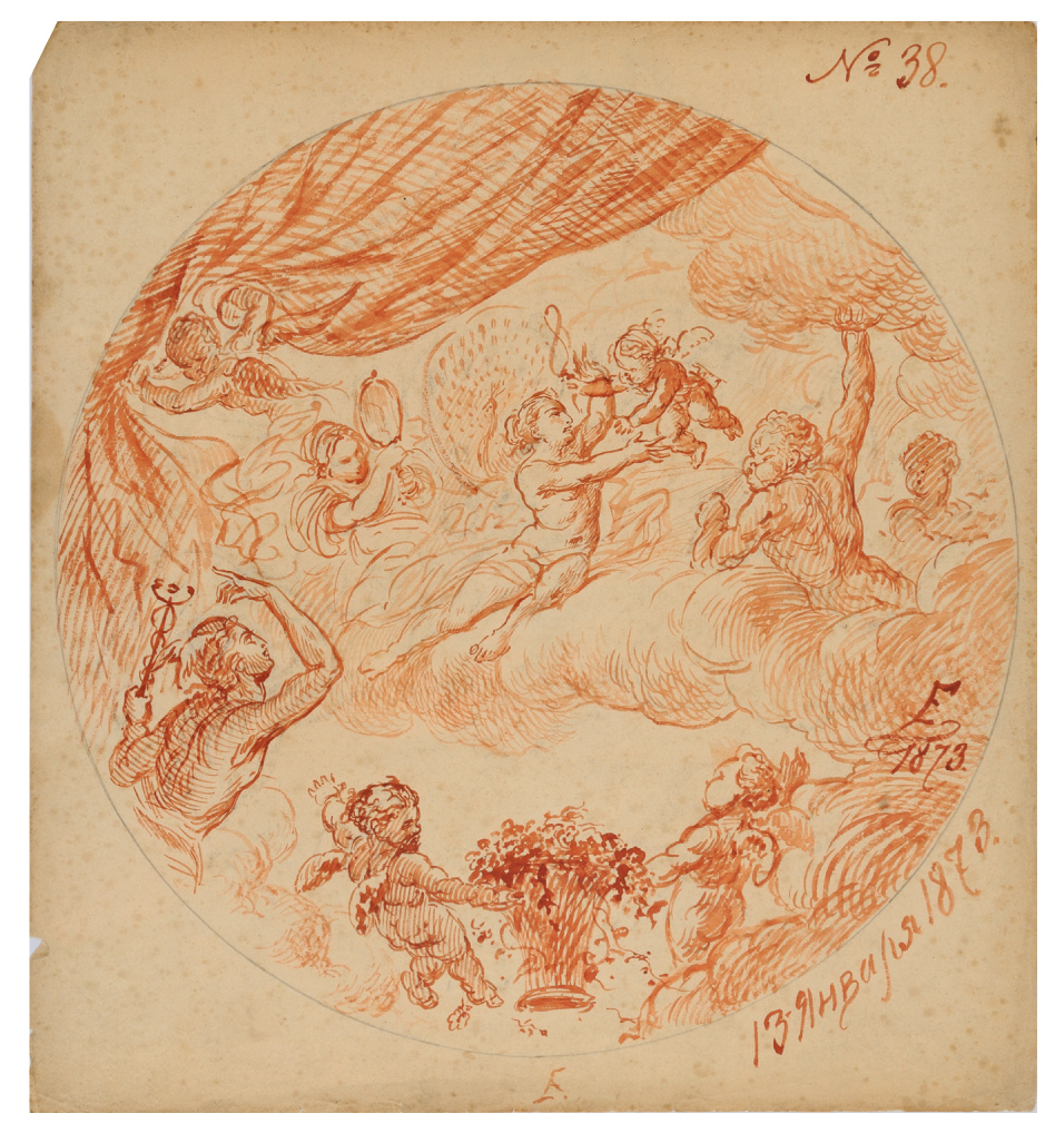 Circular view representing a project for ceiling decoration "Characters in clouds", monogram "E" of Nikolai Ludwigovich Ellert in January 13th, 1873. The famous composer Tchaikovsky created in Moscow (supervisor Nicolas Rubinstein) symphony no. 2 "Little Russia" on January 26th, 1873, based on Ukrainian folk tales. Ellert was stage draftsman in charge of decorations of Imperial Opera in Moscow and likely produced this preparatory watercolor for this occasion. Sheet in good condition, dimensions 44.5x41.5 cm.