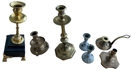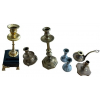 Beautiful set of candlesticks in various metals composed of seven mismatched elements: 1. large candlestick with modern golden trim for modern fireplace base on marble with small feet, 2. bedside candlestick with two circular terraces in Louis XIII style pewter circa 1950, 3. candle holder with octagonal pewter base Louis XIV style circa 1950, 4. pair of patinated kitchen candlesticks (damaged patina) circa 1950, 5. old hand candle holder late 19th century, 6. old Louis XIII style candle holder circa 1940, Russian made, 7. Brass candlestick, mid 20th century . All parts are in good condition. (7)