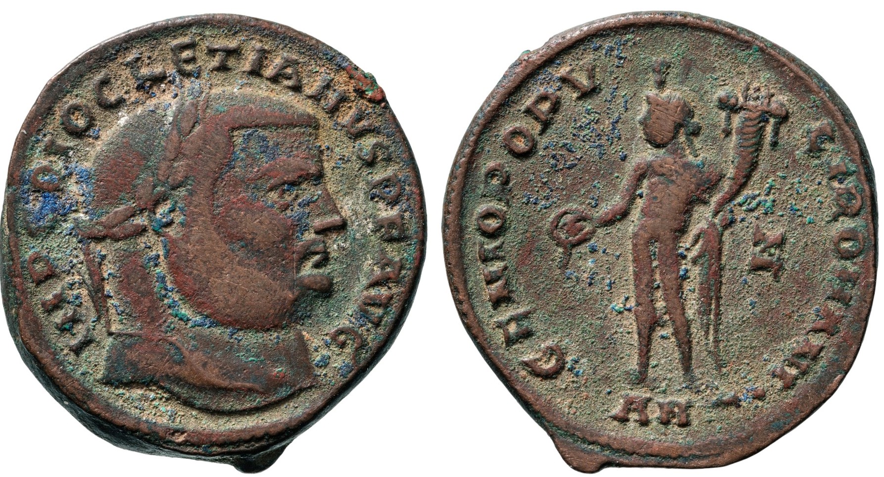 IMP C DIOCLETIANVS P F AVG, Laureate head right/GENIO POPVLI ROMANI / ANT, Genius standing left, holding patera and cornucopia; Z to right. RIC 52a. VF+