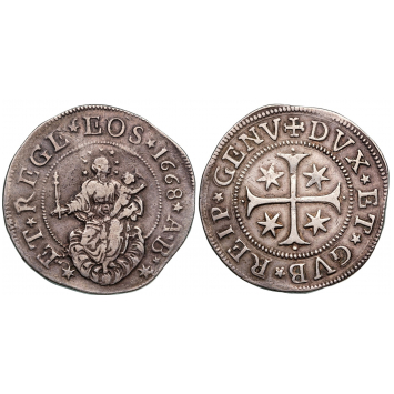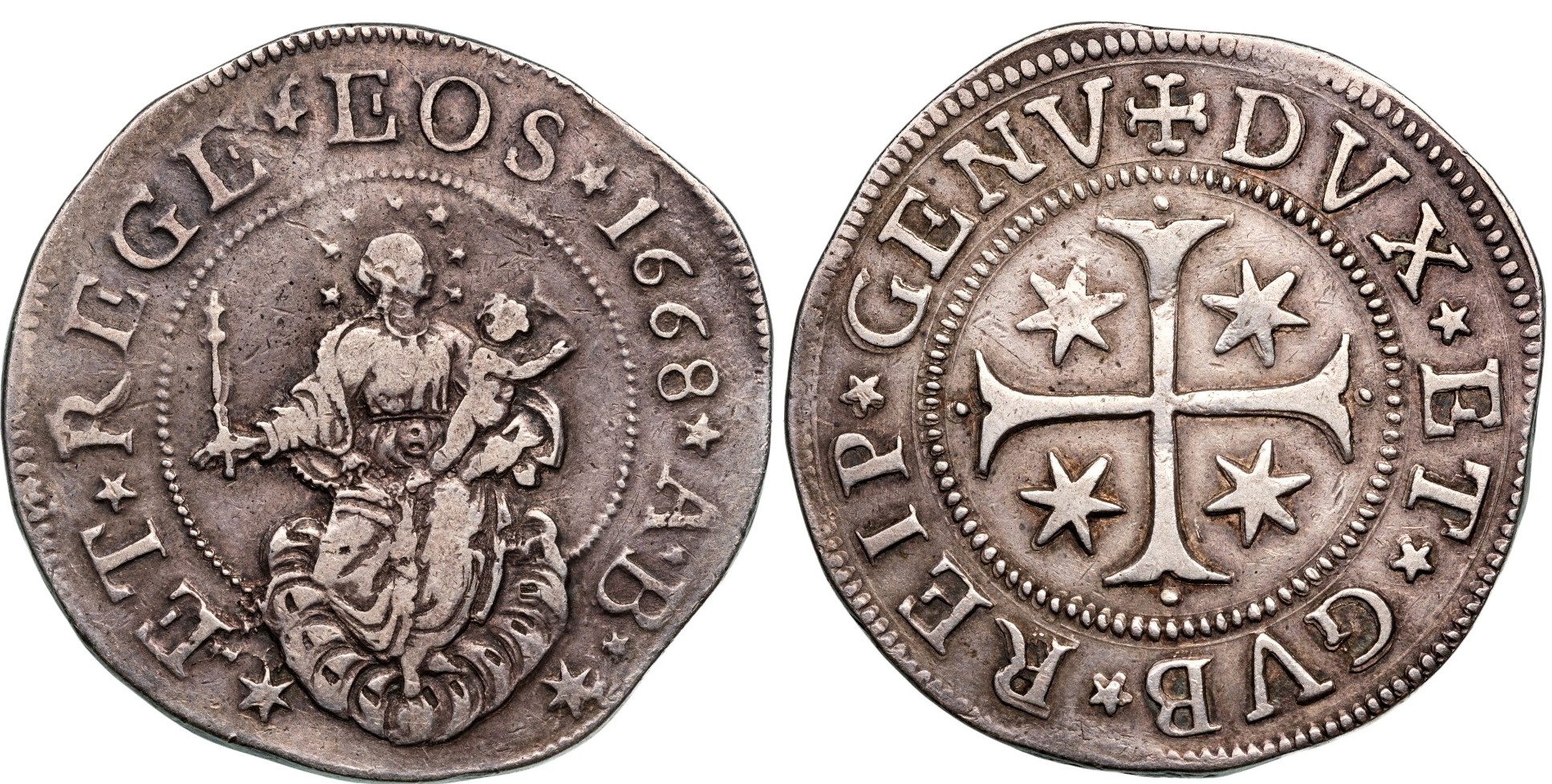 Silver, 37,86 g., 42 mm., ★ET★ REGE★ EOS ★1668 ★A★ B✶. Madonna with child /. + DVX★ ET★ GVB★ REIP ★GENV★. Cross with four stars.