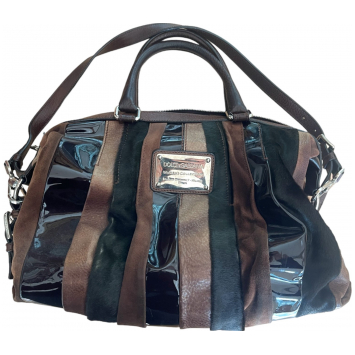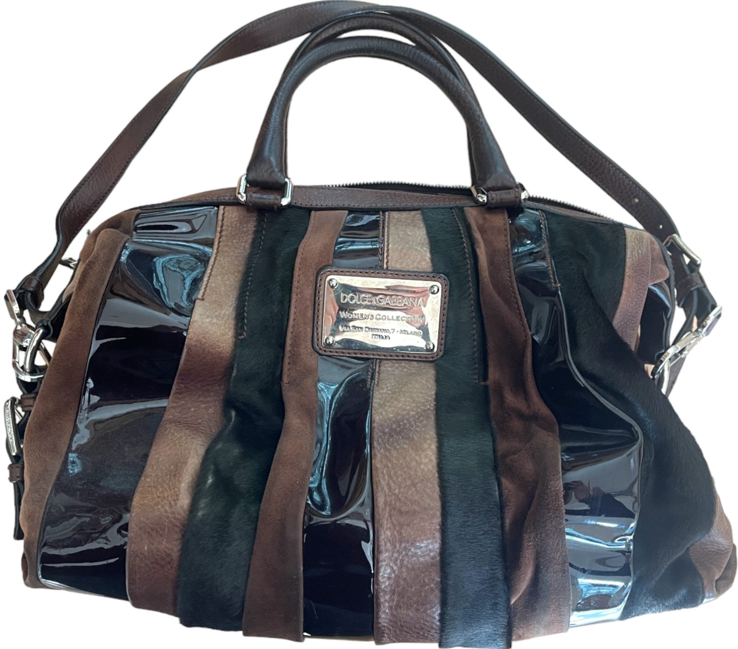 SKU: 808 Auction has finished. Total bids: 0LADIES HANDBAGSDouble handled bag with shoulder strap and brown leather, patent leather, pony hair, and suede striped body in very good condition. Dim.: 43x28x24 cm Shop ID: 58.10.46Auction LXIX