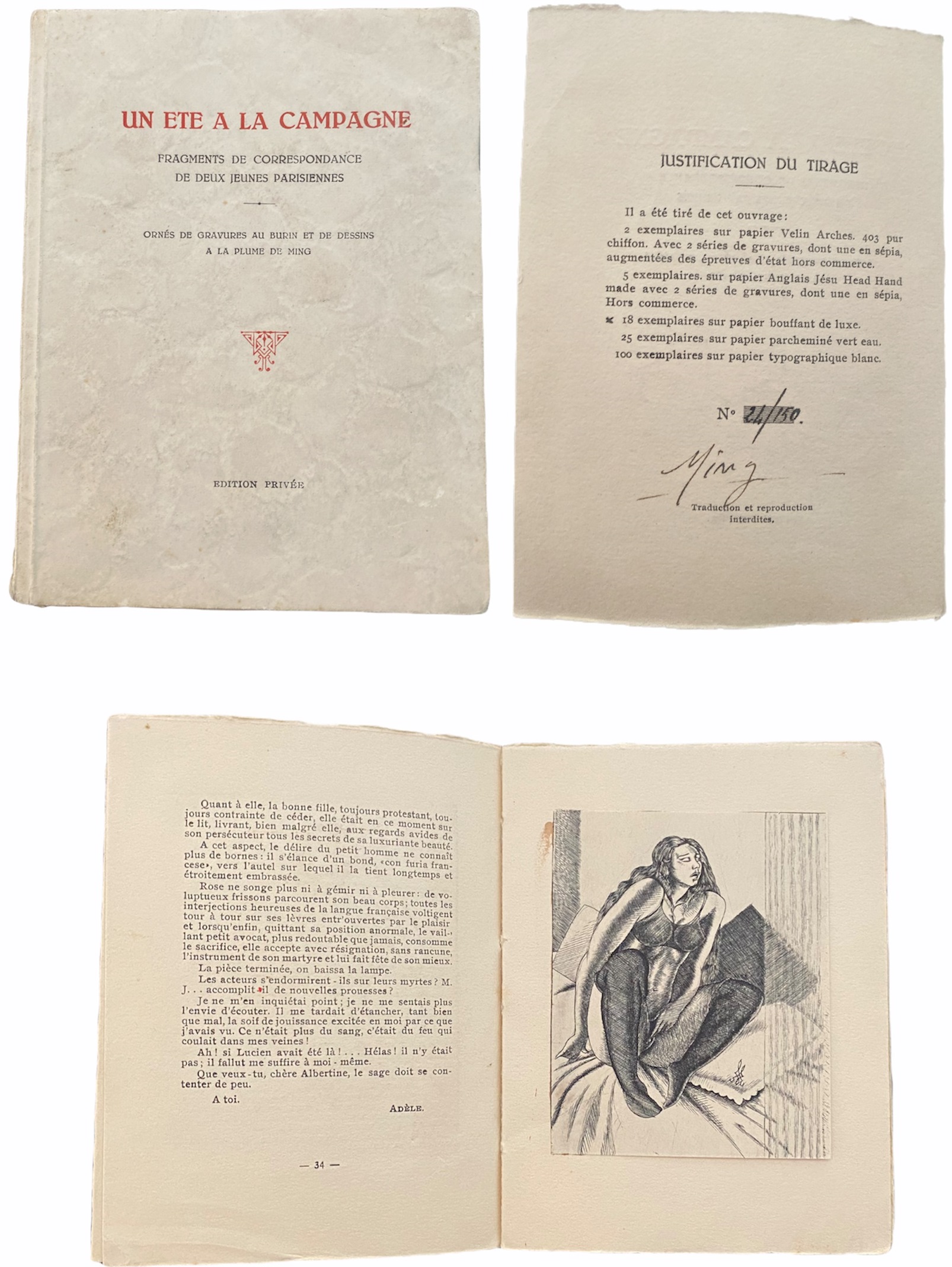 Very rare: DROZ (Gustave, attributed to) - A SUMMER IN THE COUNTRYSIDE, fragments of correspondence from two young Parisians, decorated with B&W chisel engravings and Ming's pen drawings - Private edition (16,5 x 12,5 cm), 48 pages, cardboard parchment gray, copy countersigned by the illustrator, 3rd large paper N 24 (small edition of 150) on luxury bouffant paper. In the continuity of the famous original 1868 edition of Poulet-Malassis, our edition, probably clandestine printed during the Second World War, echoes the shamelessness of society under the Second Empire. Good condition, small skin at the back.This absolutely untraceable edition is not in the inventory of any library. RR!