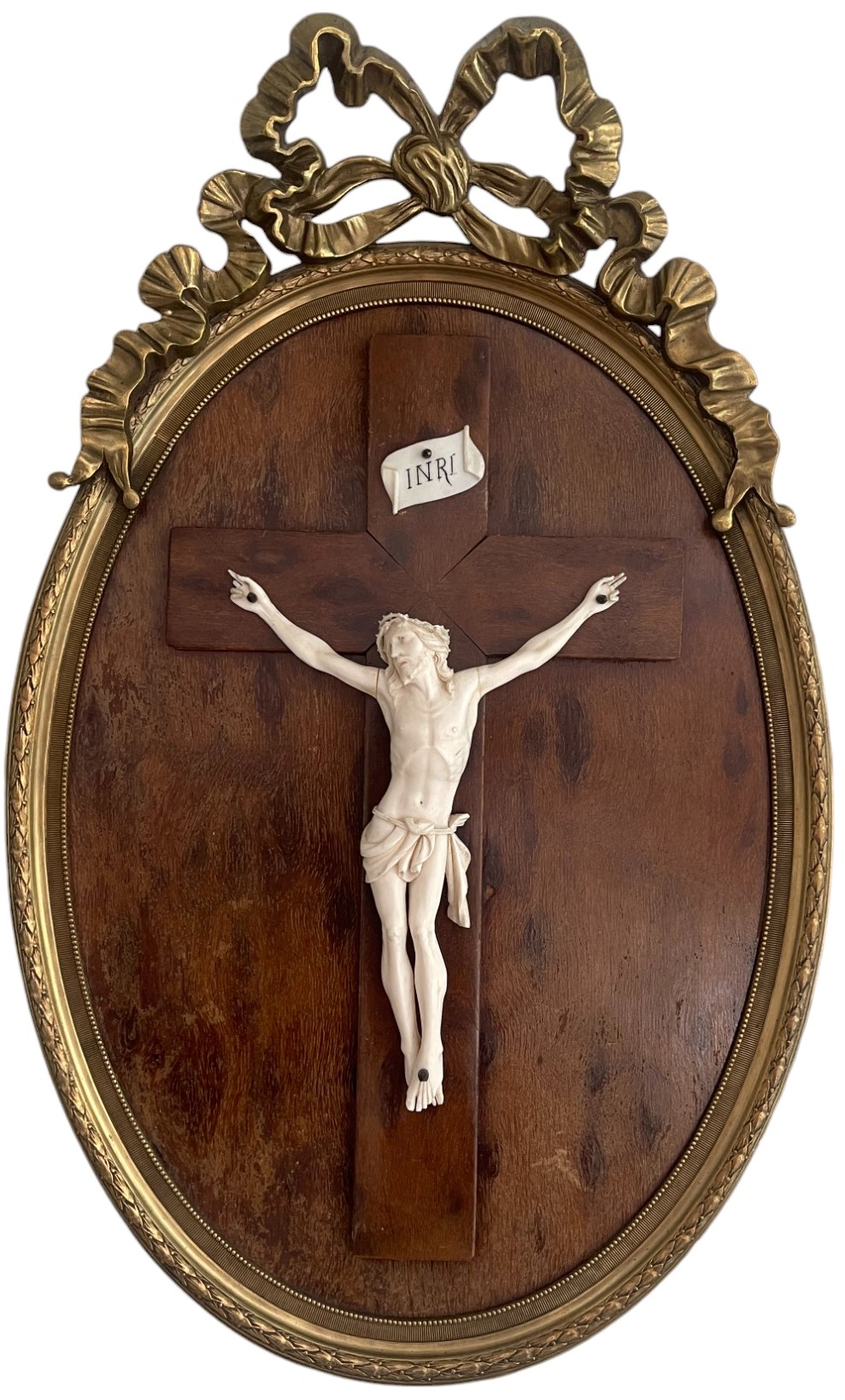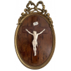 Framing the cross, Sulpician-inspired assembly composed of the living Christ polished in reconstituted ivory powder, wooden cross, oval frame with Louis XV style ribbon knot pediment, engraved silver-plated brass surround. Wooden counter-back. Dimensions 42 x 26.5 cm overall, Christ alone 15.2 x 12.5 cm. Late 19th century. Good condition.