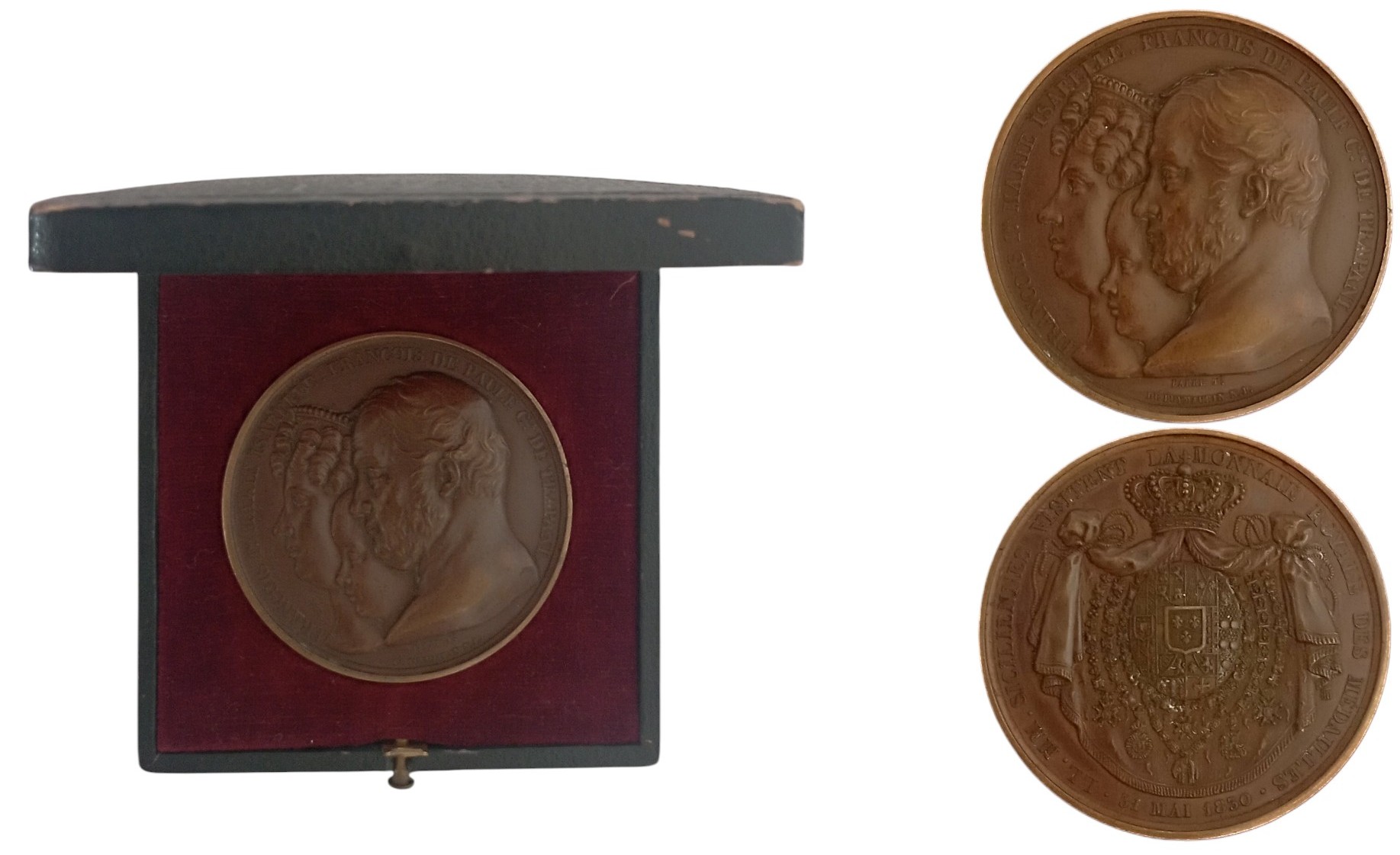 Dr. FRANCOIS 1ER MARIE ISABELLE FRANCOIS DE PAULE C.TE TRAPANI. Busts left of the King, the Count of Trapani and of the Queen, signature of BARRE F T / DE PUYMARIN N P. / LL. MM. SICILIENNES VISITENT LA - MONNAIE ROYALE DES MÉDAILLES - .31 MAI 1830