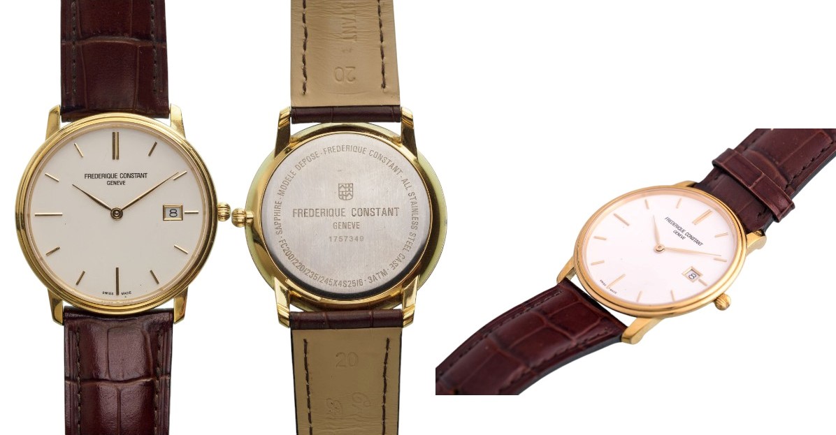 Frederique Constant men`s bracelet watch, 36.94 mm., stainless steel case, leather bezel, saphire crystal, quartz mouvement. In perfect condition.
