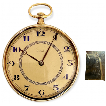 Gold Movado 18k ladies pocket watch, Art Deco style, mechanical mouvement, winder and chain ring, enameled on the back (cracked), hallmarked "18k-Helvetia head- hand holding watch". Diamenter 46 mm, gross weight 60.02 g.Perfect working condition.