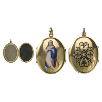Photo holder opening in medallion, oval structure in gold (18 k), hinged opening, subject of a polychrome painted miniature on shell (?) inspired by a Virgin of the Assumption by Murillo surmounting angels, back engraved with a motif of four hearts in arabesque, fixing ring. Spanish work from the late 19th century. Shards at the bottom of the miniature (explicit shot). Dimensions 37 x 28mm. Weight 8.96 g.