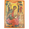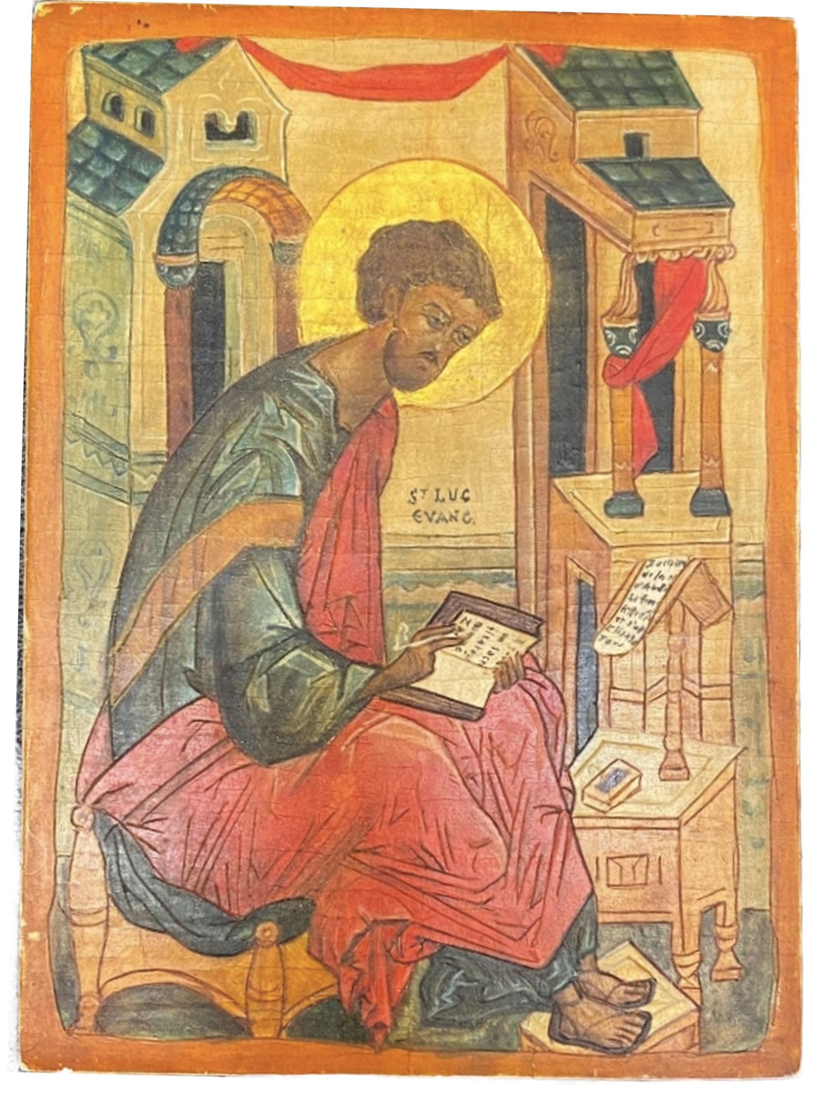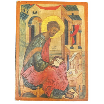 Icon on wood panel - Saint Luke the Evangelist in an architectural decor (Temple of Jerusalem), traditional representation of the bishop martyred in his writings - Good condition, fresh colors. Work around 1960 in a byzantine style, dimensions 15 x 11 cm