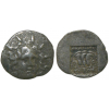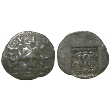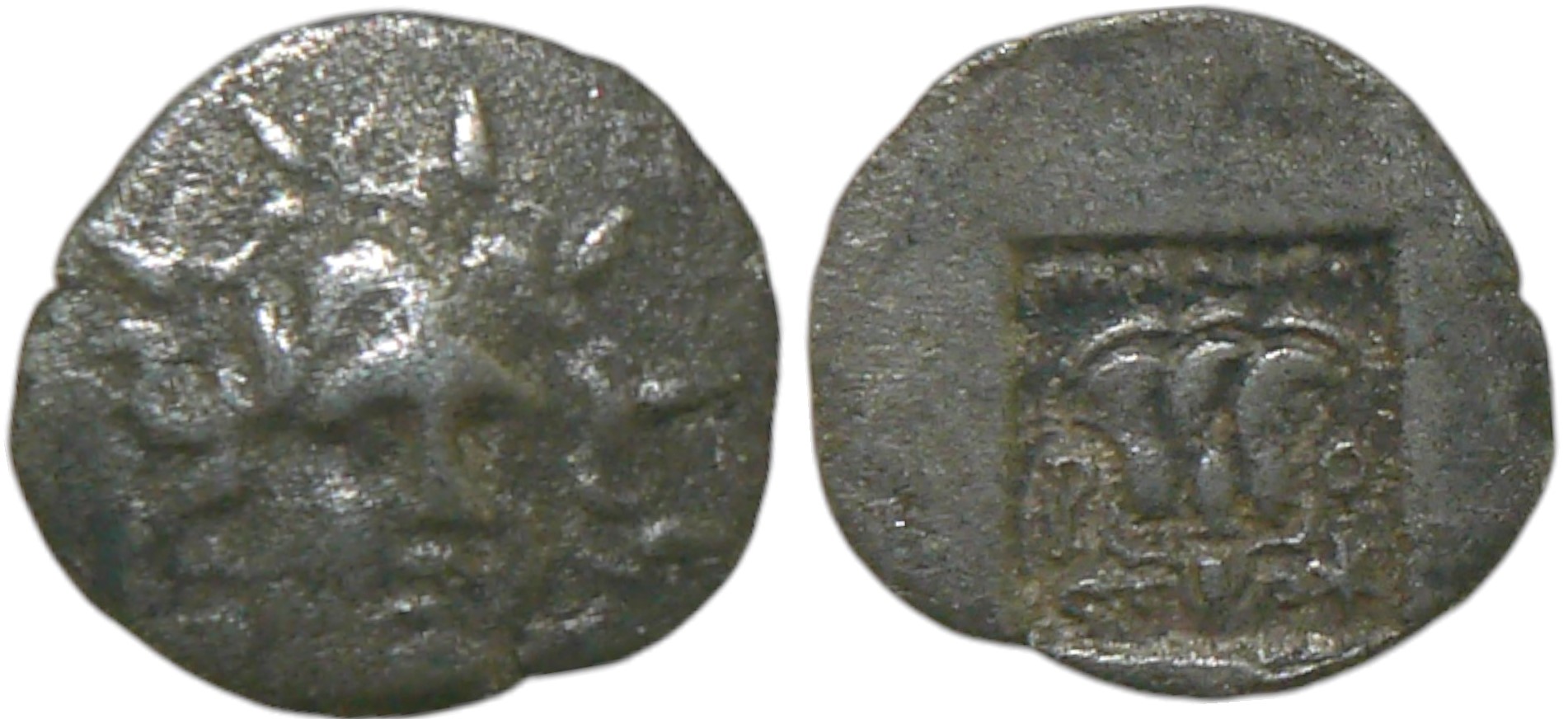 Silver (12 mm, 0,98 g, 12h). Radiate head of Helios facing slightly right / ΠHN.. Rose with bud, club in left field, P-O across fields, all within incuse square. VF