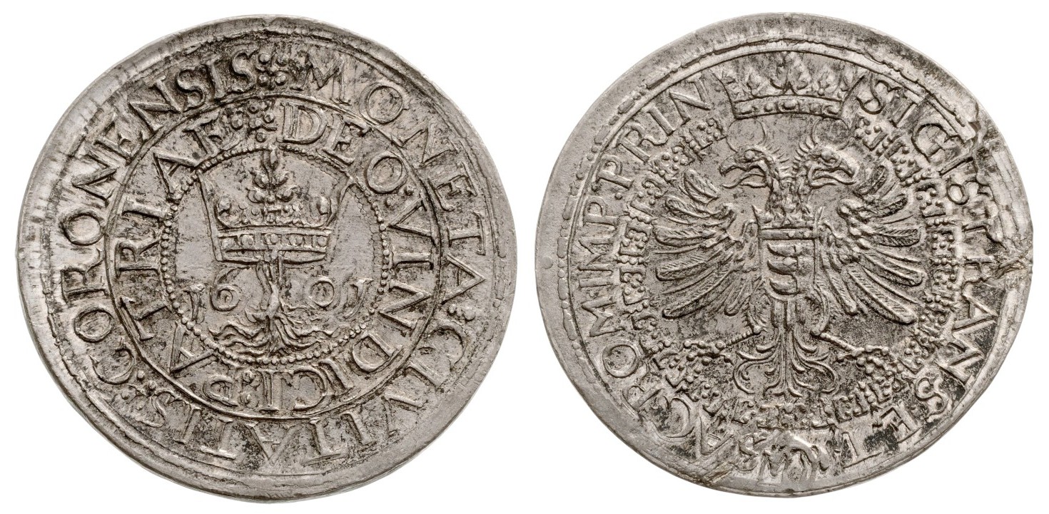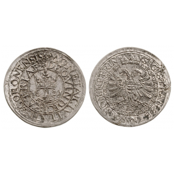 Zinc, 24.94 g., •SIGIS•TRANS•ET• - SAC•ROM•IMP •PRIN• Double headed Eagle on Bathory weapon, surrounded by Golden Fleece collar / MONETA:CIVITATIS *CORONENSIS * / DEO: VINDICI:PATRIAE * Kronstadter Weapon/ 16-01,