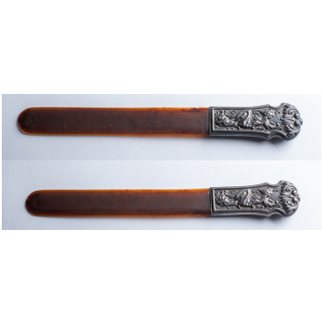 Large desk decorative element paper-cut type, consisting of a large amber blade and a silver handle embossed with a relief about a satyr. Good condition, slight fragility at the junction. Gross weight 119 g, length 32 cm. No brand, France (?) Circa 1900.